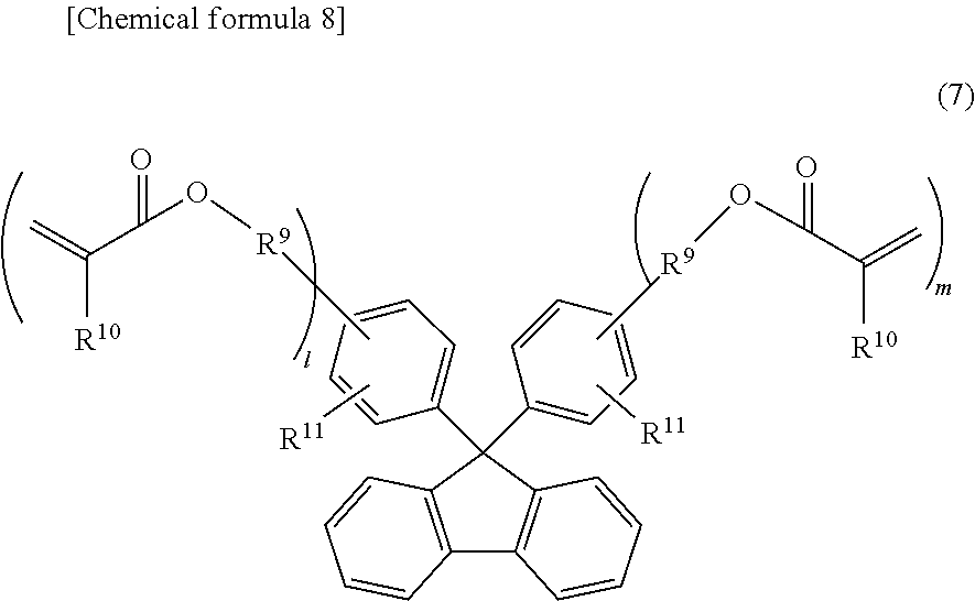 [in general formula (7), R9represents single bond, a chain aliphatic group containing 1 to 10 carbon atoms and 1 to 3 oxygen atoms, or a cyclic aliphatic hydrocarbon group containing 3 to 16 carbon atoms, the plurality of R9being independently the same or different, R10represents hydrogen or methyl group, the plurality of R10being independently the same or different, R11represents hydrogen, a chain aliphatic group containing 1 to 10 carbon atoms and 1 to 3 oxygen atoms, or a cyclic aliphatic hydrocarbon group containing 3 to 16 carbon atoms, the plurality of R11being independently the same or different, and l and m being integers of 0 to 2, l+m being 1 to 2.]