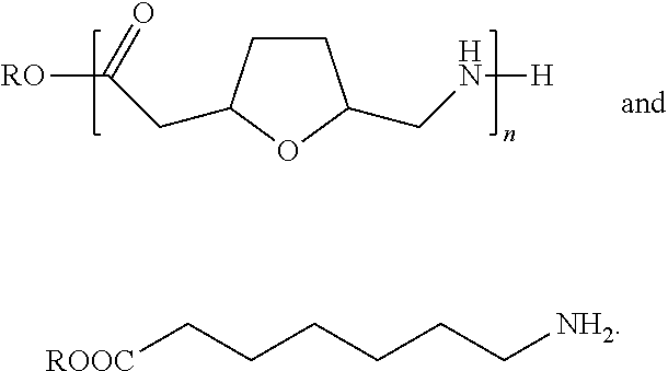 Alternatively, the polymerization may occur prior to the ring-opening of the furan ring M1 to produce an intermediary 5, generally having a structure as represented by