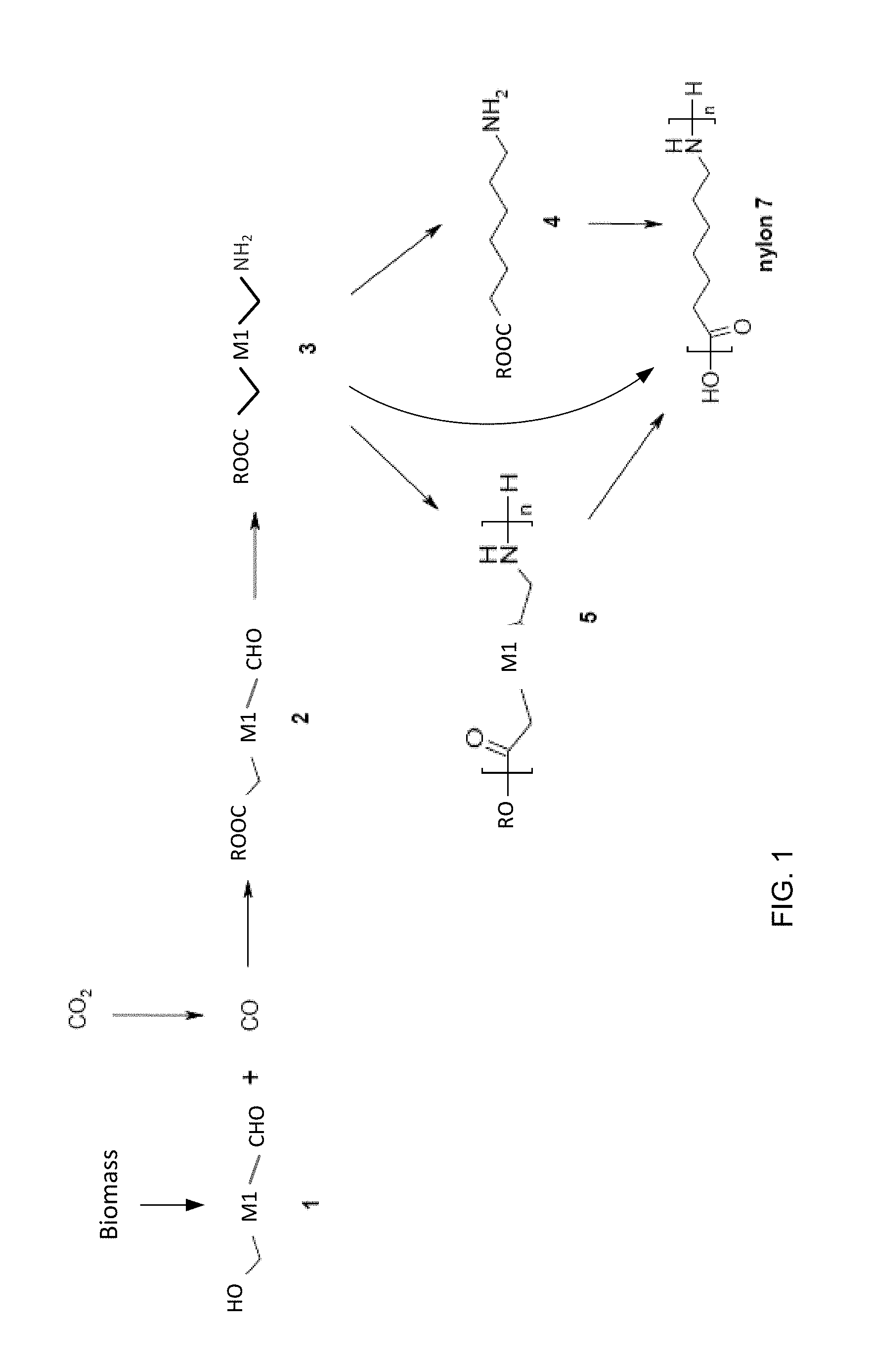 1. A method for producing nylon 7 from waste stream products, the waste stream products comprising CO2and biomass, the method comprising: