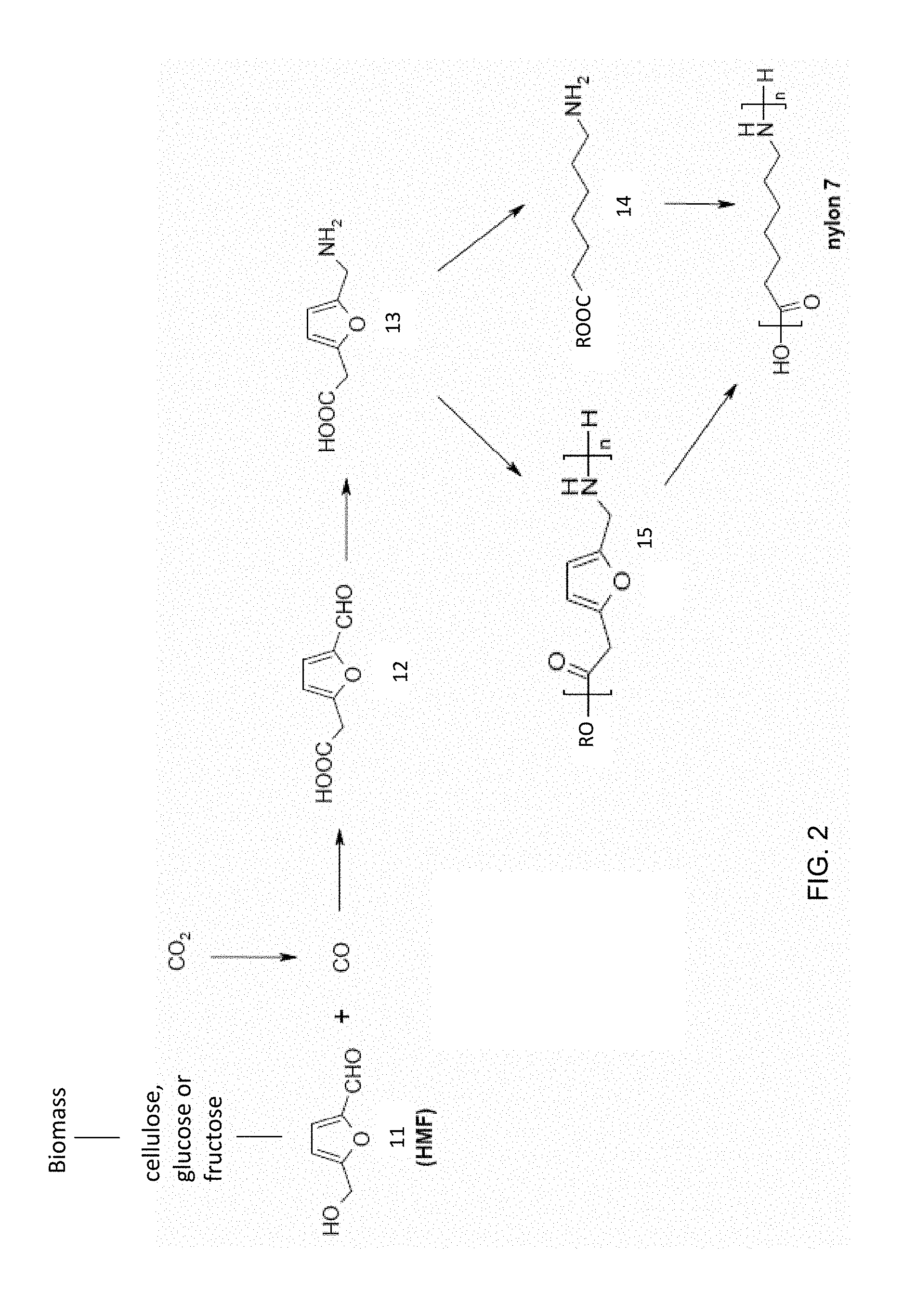 wherein R may be —H, an alkyl, or a substituted alkyl, and the amino carbonyl compounds may be converted to nylon 7. The amino carbonyl compounds 3 may be converted to nylon 7 by a hydrogenation-hydrodeoxygenation reaction that may result in the opening of the furan rings M1 and polymerization of the amino-carbonyl compounds.
