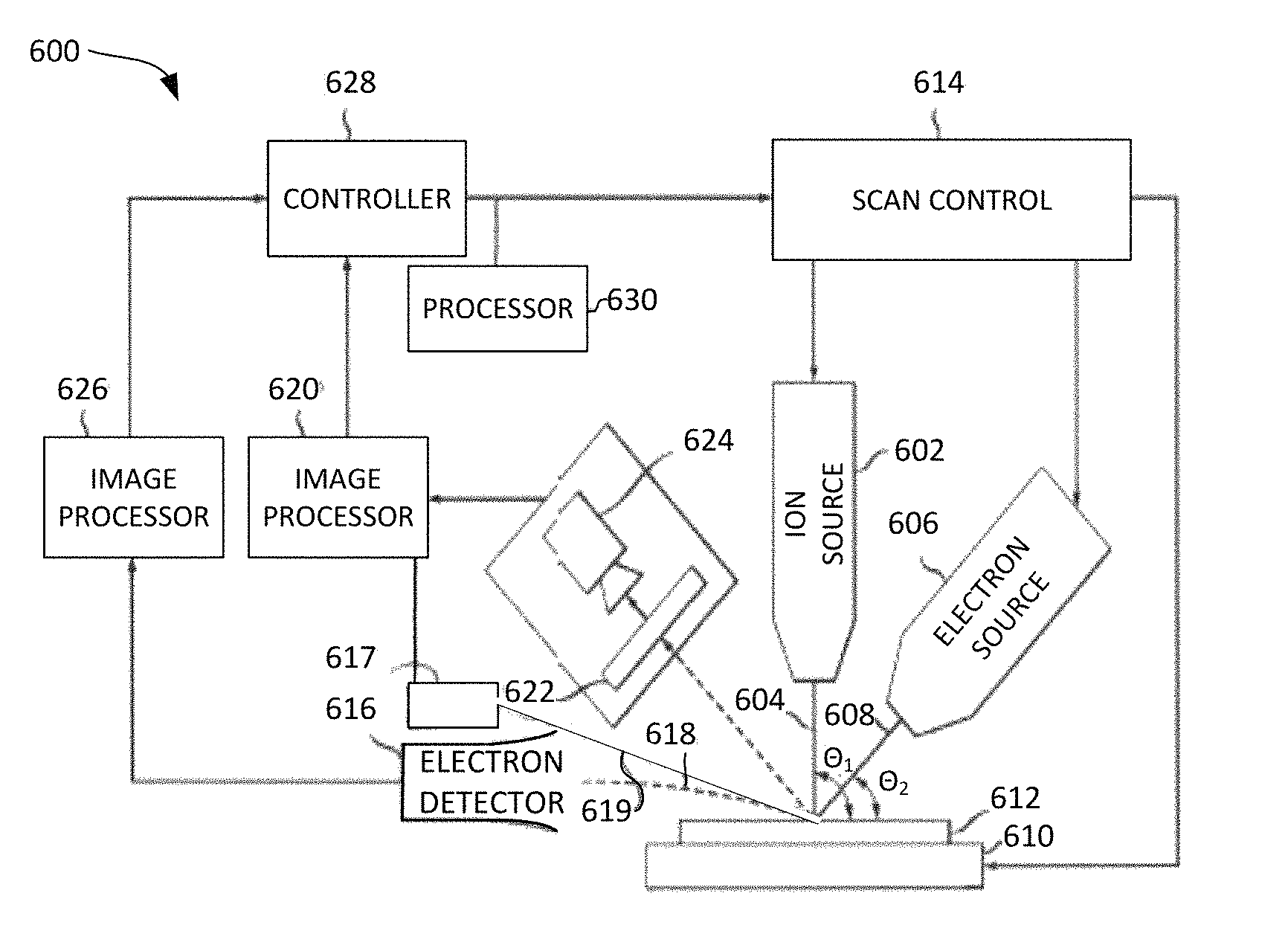 an ion optical source for producing an ion to be directed at a sample; an ion optical column for forming an ion beam from the ions and for focusing and positioning the ion beam on the sample surface; a first detector for detecting a first type of emissions from the sample caused by impingement of the ion beam; a source for producing electrons to be directed at the sample; an electron optical column for forming an electron beam, focusing the electron beam onto the sample, and positioning the electron beam on the sample; a second detector for detecting a second type of emissions from the sample caused by impingement of the electron beam; and a system controller including a program memory storing machine readable instructions for performing the method of 13. A method of characterizing a work piece having crystal grains, the crystal grains having crystal planes having a crystal plane orientation, comprising: