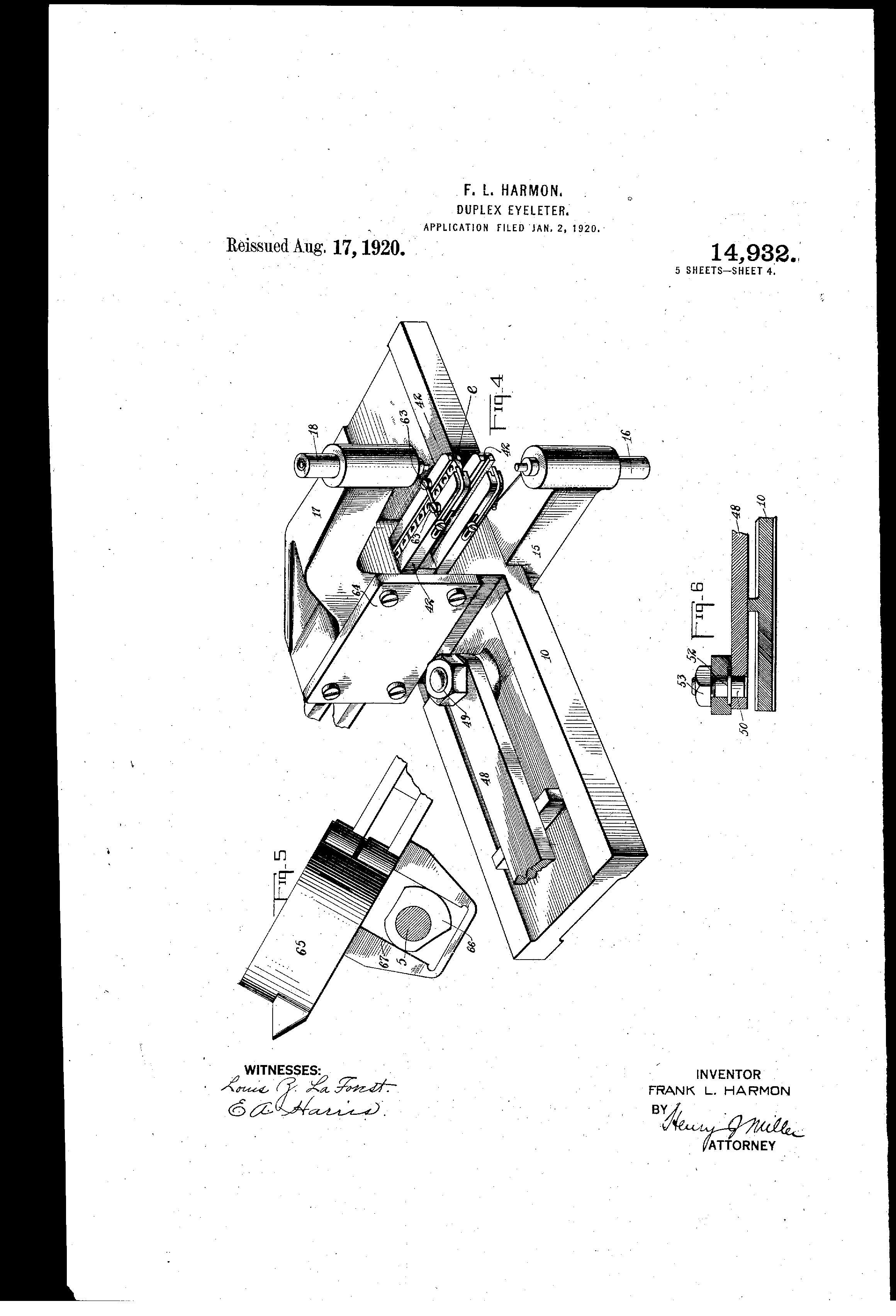 Letters Patent is: 1. A dtiplex eyeleting machine, compris- 75 ing a pair of t6lesco- ically combined puncli p q@nct set mech,,tnisms mounted opposite each -@ed ith other a materi,@l support eqtii w I p punch - bloc]K ancl :-61eiiehing, stirfaces at its' two sides moun'Lecl between said ptinch ind 80 set mechanisms metns f6r first haoving said punches siriililt,,tneous - ly to- punch the material@.and therepftet m6viiig the sets simtiltaneously to clench the eyelets, tnd: means for moving the punches latertlly while eD- 85 gag red- in the materitl to feed the -same and space th6 eyelets. 2. A cluplex eyeleting machine,- comprising a m,,tterial support,,qi,,i pedwith,punch Sur block and clenchin- Ices- on opposite go sicles, a-- ilurhlity oftelescopically combined punch and set mechanisms mounted to act lgLinst the opposite 8ides of s,,tid material slipport, mechanism for movin-- the Dunches fotward to punch.th-, material and -thereqfter mbvin the.sets forward to clench the 9 eyelets, and ibetns for ii@oving the punches la,terally together,while in the iiaaterial to foed tlie, same and space the @eyelets. 3. A.duplex eyeleting machine, compris- loo i--,ig "I M,,iterial support htving plinch block lqnd clenching surfaces on its opposite sides, a plurality of telescot)ically combined punch and. set mechanisms: mounted to operate on the op posite sides of said material siil)port, ,i single actuating mechanism for operating said ptiiieh ,Liicl set: mechan;sms t6 first plinch@ the m,,tterial and thereafter clench the eyelets, and a single, -,tctLiatino, means fc@r moving the pimehes laterally, I I 0 while in the materitl to feed the s4tine . and sp,,tee the eyelets. 4.: A @ duplex eyeleting maelline, comprisin- material supportin- means having punch block tnd clenchin-g surfaces on op-, 116 posit6 sides thereof, ,t plur,@lity of telescopically combined punch and set mech,,tnisms" a common molinting therefor holding said mechanisms in opposite relation, meins for op6rating said mechanisms simultaneously 120 to first pilneh the M,,Lterials and thereafter clench the eyelets, and means f6r moving the plinch and set @mechanisms together laterally while the punches -,Lre in the mateice th rial to @p, o eyol6ts. 125 5. A duplex eyeleting machine, compr'19ing station,,try means for supporting iiaateIrial having @Uilch block,.thd clenching surfaci@s at opposite sides, a p,,tir of telescopically combine(I ptinch and set mechanisms 130