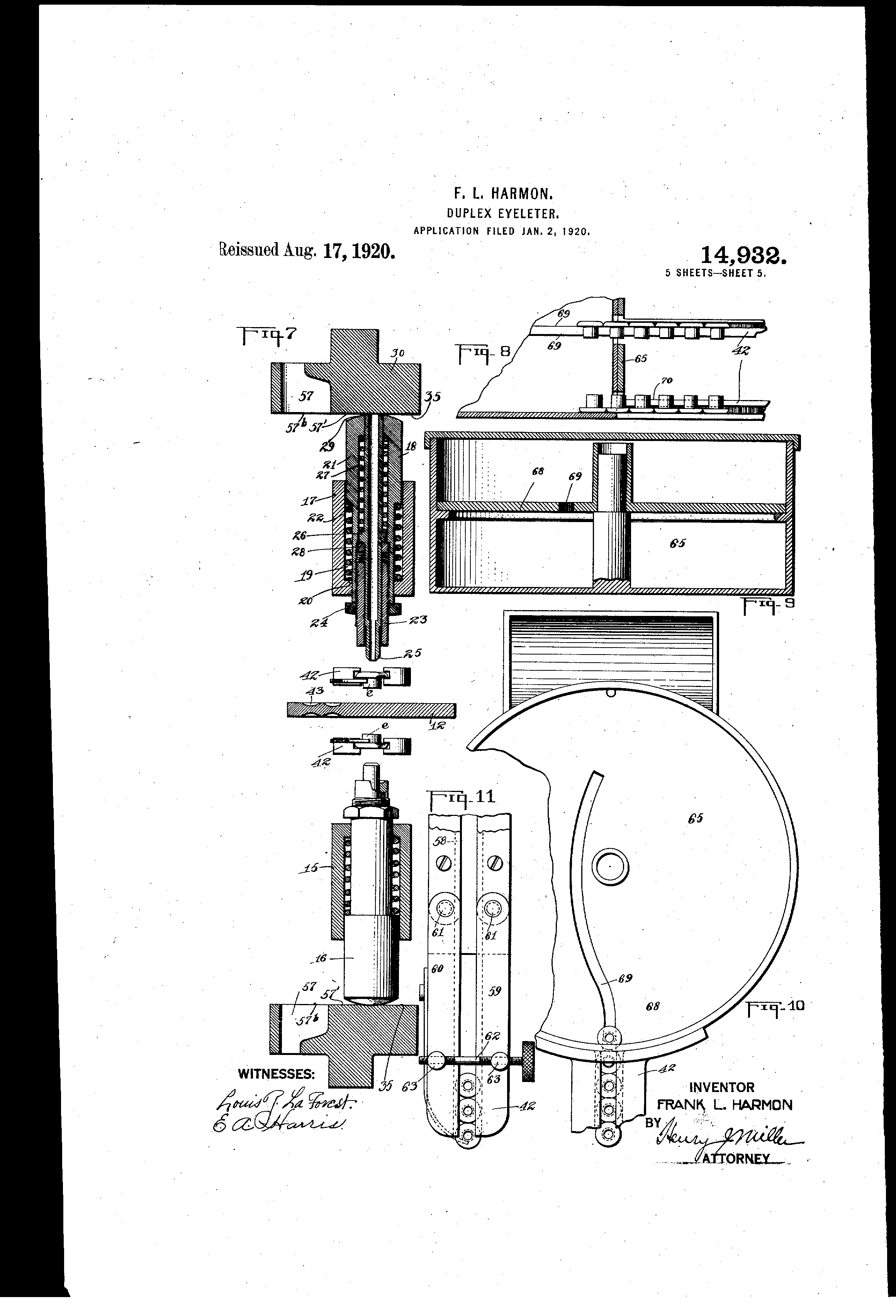UNITED@ STATES PATENT OFFICE. FRANIK L. HARMON, OF 33EVERLY MA,SSACHUSETTS, ASSIGNC)P. tO SINGER MANUFACTURING COMPANY, OF ELIZABETH, NEW JERSFY, A COP.PORATION OF NEW ITERISEY. DUPLEX EYELETER. 14 932., Specification of R-.issued Letters Patent. Reisstied Aug. 17, 1920. Original No. 1,262@583, dated April 9, 1918, Serial No. 839,324, filed May 4, 1914. Application for reissue Aled Tanuary 2,;1920. S,erial No. 349,030. To alltvhoin it may concern: Be it known th,,it I FRANI@ L. HAR-L40N, a citizen of the Unitecl St,@tes, residing:,,tt Beverly, in the cotiiity of Essex and State 6 of tell-Lisp 1-i,,tve invented certli,il'i DeAv - M,,iss, tts@ and tisefitl Improi,ements iii Duplex Eyeleters, of whicli tl-ie folloal'ilig is t specifi@atiol-i,@ reference being h,,td@ th6rein to th'e ,tecomp,inving draivin gs. 10 This inventioli relates to, d-Lll)lex @or doll.ble eyeleting maehines of t type @--vhetein the usual spindle-,,in ' d-set mechlinism i.s elimiiiated, @tnd'iii Avhich the ptin@elies iiisert tl-ie I ,6yelets int6 the holes, the miterial being fed 15 for tl-i-e eyelet spiieing preferib@,y ],)y Li lqter.tl movemeilt of tl-te I)tinches. Accordiiif,@ to my iniehtion I m6iint i telescop,,-',Illy combined plincli I and set at 6ach side of .t' materi-,i,l supi)ort i)refer,,tbly iii opposite re20 lati.on, the tnvo sides of the -rfiat-riil sti,)port being formed and adap@,ed to serve as ptinch block cleriching surfaees. The op(,,ratin- p,@trts of -etel-i of the punch ,tp(l set nliech,,tirlisms at the res ective sides of the p 25 materii,l support I ,Lre all oii the s,-,i,,ie sidc@. of th6 sul)port, -whereby@a gre,,tt siiiiplitieg.tion of oi)er,,tting mech,-i-iisni is -r@qti,de I)ossibl.e. I @elieve tfi,.tt the pr6 @ent chine is the first ol' this t i)e in_ @lthich t y@@ 30 telescot)ically.combinecl plinch and set d-19- osed @l-n oT)p6site 6r d-Liplex rel,,ttions is er@q-. p ense ptoyed; also th,.tt I am the first- to C[iS'I) Nvith the LLs-Li,.il se,ts havin- spindles tl-ierein ' i@-i s-Lich a cluplex m,.Icl-iine. It ivill :be Li@.id-Ir35 stood that there is ,t gre,.tt ad-@,a ,,(I-e in clo-, ing I"TEy I'Jith tle spindl,-,s ',,ti d@ s@-ts together with the iiecess,,iry operot n6- z correct aliiiement by ,t single mountin(y ele- 55 ment. this insuring that the spacing of the eyele@s in one I)iece oi: M',,iterial sh,,tll be exactly the stme "is in tl-ie other bein- opere on. A fiirther feitiire b,,is to do Avith iii ini- 60 proved constrii.eti0ii of p-Lliieh telescopie,,illv combined with ,I llolloiv set illld ,L,- I;ustiii@, ri-rovision th6refor.@ A still -'Further fe,-tture, has todo with an -im roved mech,,tnism 'or , P s@i-ipplyin,@, ey6lets from @t hopper 'n t t, i Avo r,,ice- 65 ways,witli the, heads of the eyelets in 'che t-wo r,,teeivay lines 'Lacin oppositely. 9 A still further 6bject has to do Allith an adj-Listn@eiit of the del'Lvery elids of tle r@teeivays for different sized eyelets. , 70 The above tiad 'ollier objects ti-id fe,,ittir-'s of the inventiop- Avill be be@uter tiliderstoo(-l from the follo-,vin(,, det,@iled description talken in conriectio@q wi,L-Ili the accomp,-Lnyi-,icr draivings and, i@jill be tl-iereafter pointeci oti-t 75 in the appoi-ided claims. !- '%,eferriiig to tl,@e dr,,t-",ings. illi u re I is .t s@lde elov,,t'Lioii of a m,,tehine constructe d iii accordince with n-iy ijivent,ion; 80 1-@io. 2 is ,t T)Ian vieiit thereof loolcinr,- in the ctirectioi-i of arrow 2 in Fig. 1; Fil- 3 is f 1 , a ront Ariew look'n,y in the clirection of arroiir 3 in Fi(y. I Niilu-h lu-Iiie base broken a-"7ay; I-@i - 4 is t p,@rspectii,e showipu ,-he com- 85 9 mon eprrier of the Ijuinche-@; and sets and 't,h-, rtceiviys, det,,,i.elied from the rest of the m,,ichine; Fig. 5 is all elevqtioji ol the eNTelet stipply go 1-iol)per wi.tli e66i)eratip@g i),@trt,.@ brol@en,,i-wa y nism ther6for since stich operat.i-i; mecha-, , Fi 6 is a se(i@uior)al cleittil sho-Nvin, a coii9- P-isrn in a dtiplex machine,is necessarily' nection for effectini,), the tt,,iiisverso move40 reli;tively com lex tiid involve(,I. I boliev,e@ Iment of the punches qiid sc,Ls; p th,,it,,tiiy employment of sets ivitl-i t-lescopic Fig.. 7 is ,ip, enlarged detiil partly in sec- 95 plinclies therein in conjuncti6.n -",ith an eye- tion ,.ip-d i)artly in elov,,Ltio . I II of the immelet spacing feed of the m%feriftl is AlTitf-ii-n dictte ivorkiii,,),- 3,",,Lrts of tl-ie machine; the spirit of the present iiivenfio,.i is hereitii,,@ ,i, fra(ymentary ,@,ectionil det,,til 45 ,tfter developed. According to a IL7Lirtlier shoivinff I delii,ery portio-.@-i of the eyelet fea.t-Lii.-e@ of the inventioii th- --,)unches -tiid hopper zthd a p,,trt oT the rteew,,iyg; 100 10- J. L ii sets are @mounted for reciiline,,Lr movemeiit F'@n. 9 - ,,, tr,,,,nsverse sec'ion,tlirou,@ the both for feeding ,tnd fo@ their ol )er,,Lti@e eyelet hopper; @trokes, instead of in a clirved'line ,is hcts Fi@o-. 10 is .i plan vie-v@,. of tho eyelet iiopper 60 been Lisual heretofore this contribtiting ma- with the- cover removed and a i,),,irt b-.-,ol<en torially a , @to rapid and,,teelir te o-iiidino- of the aivay;, and 105 -work. A ftirther feature has to do ",ith an Fig. 11 is ,t T-r,,Lgmentt ry elevatiot-i of the improveet mounting of the 13unches anOL sets deli@er,-@ ,-,ortion of in eyelet chut-,. y hereb @ they are all carried ancl held in. The 'base stipport I of th-!@ machine li,,ts an