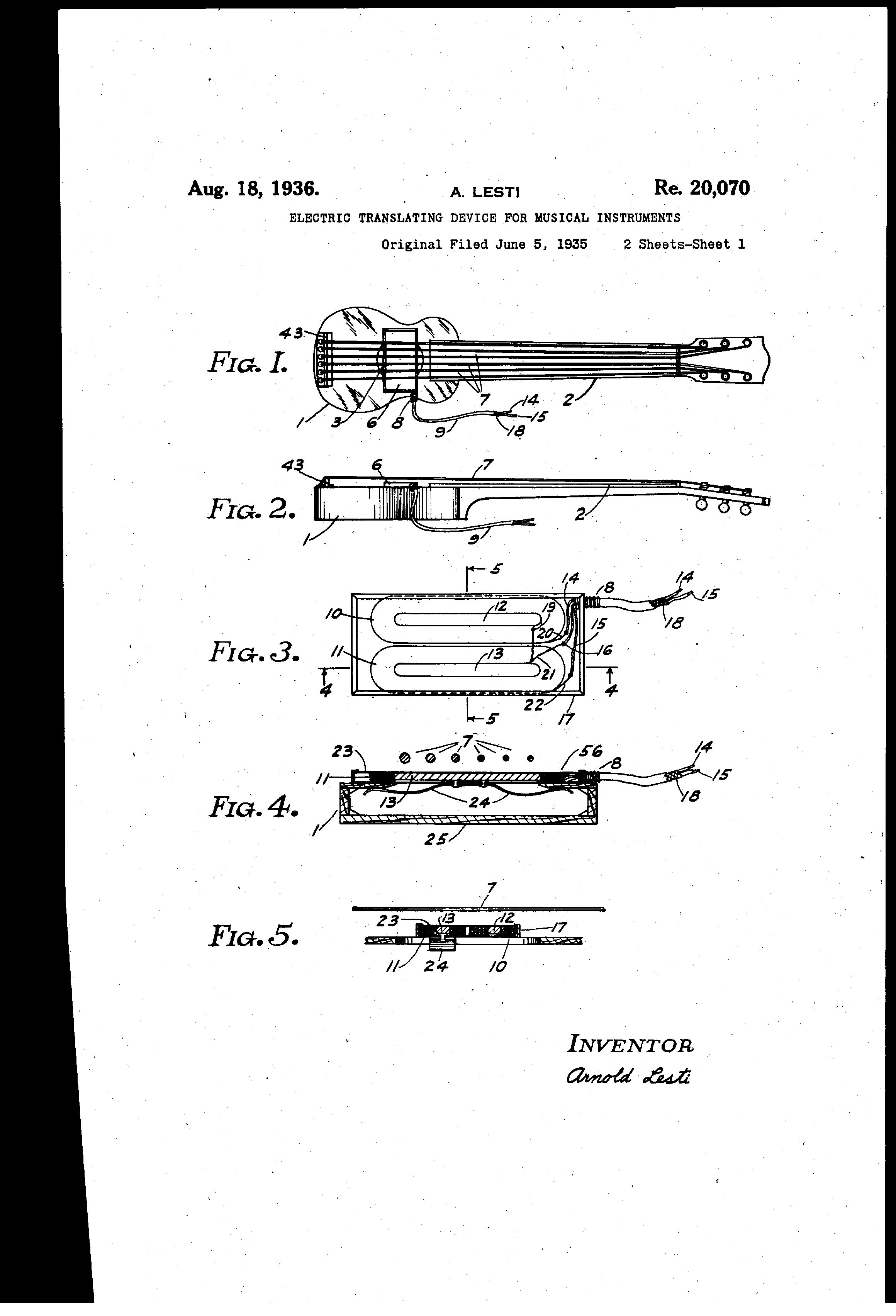 Rei"ued Aug. 18, 1936 Re. 20@070 UNITED STATES PATENT OFFICE 20,070 ELECTRIC TRANSLATING DEVICE FOR MUSICAL INSTRUMENTS Arnold Lesti, Los Angeles, CaUf. Original No. 2,026,841, dated January 7, 1936, Serial No. 25,100, June 5, 1935. AppHeation for reissue April 22, 1936, Serial No. 75,862 25 Claims. My invention relates to an electrical translating device for use with musical instruments which are not sufficiently loud when played in the normal manner. This device translates the musical vibrations Into corresponding electrical values and these are electrically amplifled and then translated into corresponding sounds by a loud speaker. The Invention is particularly adapted to steel stringed musiqal instruments such as the guitar. An Important object of my invention is to provide an adequate electrical translating device which is sufeciently small in size so that it may be easily attached to the most effective part of the musical instrument or easily detached from the same. Another important object of my invention is employing a solenoid means which may consist of one or moie electrical windings with or without a core but preferably with an iron core to' form the translating device to produce electrical currents caused by the vibration of the steel strings of the musical instrument. Another Important object of my- invention Is utilizing the @ame solenoid means with one or more electrical windings for magnetizing the steel strings which form the vibrating members of the musical Instrument, this being done by passing a direct electric current through the solenoid means, that is, the one or more electrical windings, for a short period of timeand then opening the direct current circuit prior to the playing of the instrument. In this connection I preferably provide a simplifled electrical switching means whereby the player of the instrument may close the direct current circuit for a short period of time, then open this circuit and close the amplifying circuit before playing the instrunient. A further object of my Invention is to provide an adequate translating device which will faithfully reproduce the musical tones of the instrument and not extraneous mechanical vibrations which may exist in the body of the Instrument when it Is played. I bave found that this feature is met by a translating device utilizing solenoid means to produce electrical currents caused by the vibrations of the steel strings of the musical Instrument, the said strings being p'ermanently magnetized beforehand adjacent to the solenoidal pick-up device. The solenoid nieans may be one or more electric windings arranged closely contiguous to all of the vibrating strlngs, preferably arranged with coil or coils extending transversely across the ngs of the instrument where such strings are (Cl. 84-1) arranged parallel or nearly parallel so that the assembly forming the solenoid means, that is, with one or more wire coils, reacts with the magnetized strings as the translating device and also functions for magnetizing all of the strings at 6 the same time when the direct current is passed through the coil or coils for a period of short duration. With my invention when the instrument strings are magnetized and then one or more of the strings are vibrated, the magnetic 10 field of the strings is itself placed In vibration. In this connection, a further detailed object of my invention is to provide means of changing the relative intensities of the bass and treble notes by m<)Ving the above mentioned solenoidal 15 device into proper relation with the magnetized portions of the steel strings. Where the solenoid device consists of one or more wire coils, such coil or coils may be adjusted to have different intensities of magnetizing effect on the bass and 20 treble strings of the instrument and also being susceptible to different reaction,s in the intensity of their electrical translating action when the bass and treble strings are vibrated in the playing of the Instrument. 25 Another Important object of my invention is to provide along with the above mentioned feat tures, a translating device which is free from pickup action engendered by extraneous electrical and magnetic influences. These last mentioned 30 influences are found to produce extremely objectionable noises. In the construction of my invention I have found that two or more solenoids may operate together so that each neutralizes the effects of the other insofar as extraneous un- 35 vianted magnetic influences are concerned, but that their positions with respect to the vibrating' magnetic portions of the musical lns.trument, causes an addition or summation of their respective translating currents. 40 A further detailed object of my invention is to provide means for properly magnetwng the steel vibrating members of the musical Instrument in a manner which will produce maximum effects. Wbile in some r-ases one magnetizing coil prop- 45 erly arranged in regard to the ' strings of the instrument would be satisfactory, nevertheless it is preferable to construct the solenoid means with a plurality of electric windings or coils arranged parallel to each other and extending 5o transversely across the strings of the musical Instrument where a plurality of such strings are closely contiguous one to the other. With the foregoing and other objects in view, which will be made manifest in the fouowing- de- 55 tailed description, and more @@icularly In the annexed clainigl-..reference is had to the attached drawings for an illustmtive embodiment of the invention wherein, 5 Flgure I is a plan view of a guitar with my Invention applied thereto. Mgure 2 Is a side view thereof. Mgure 3 is a plan view of the translating device with top cover removed. 10 Mgure 4 is a sectional view throiigh the line 4-4 of Figure 3, and showing also how the device Is held to the instniment at the sound hole. Figure 5 is a sectional view through the line 5--5 of Mgure 3. 15 Mgure 6 is a plan view of the translatin