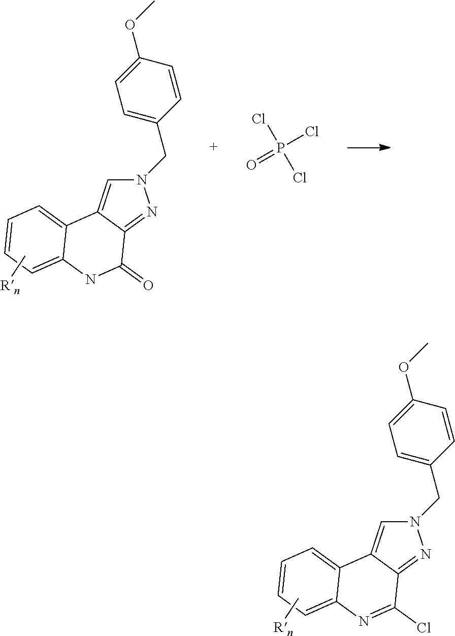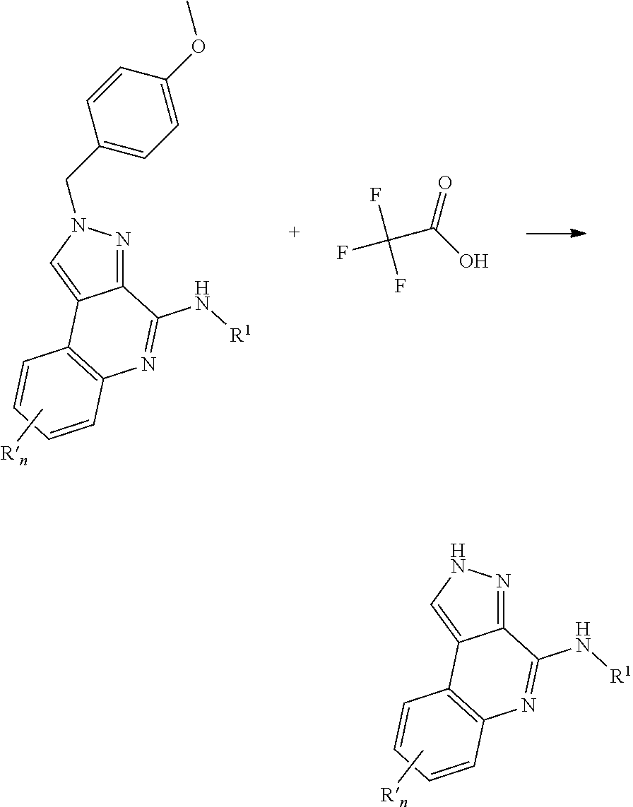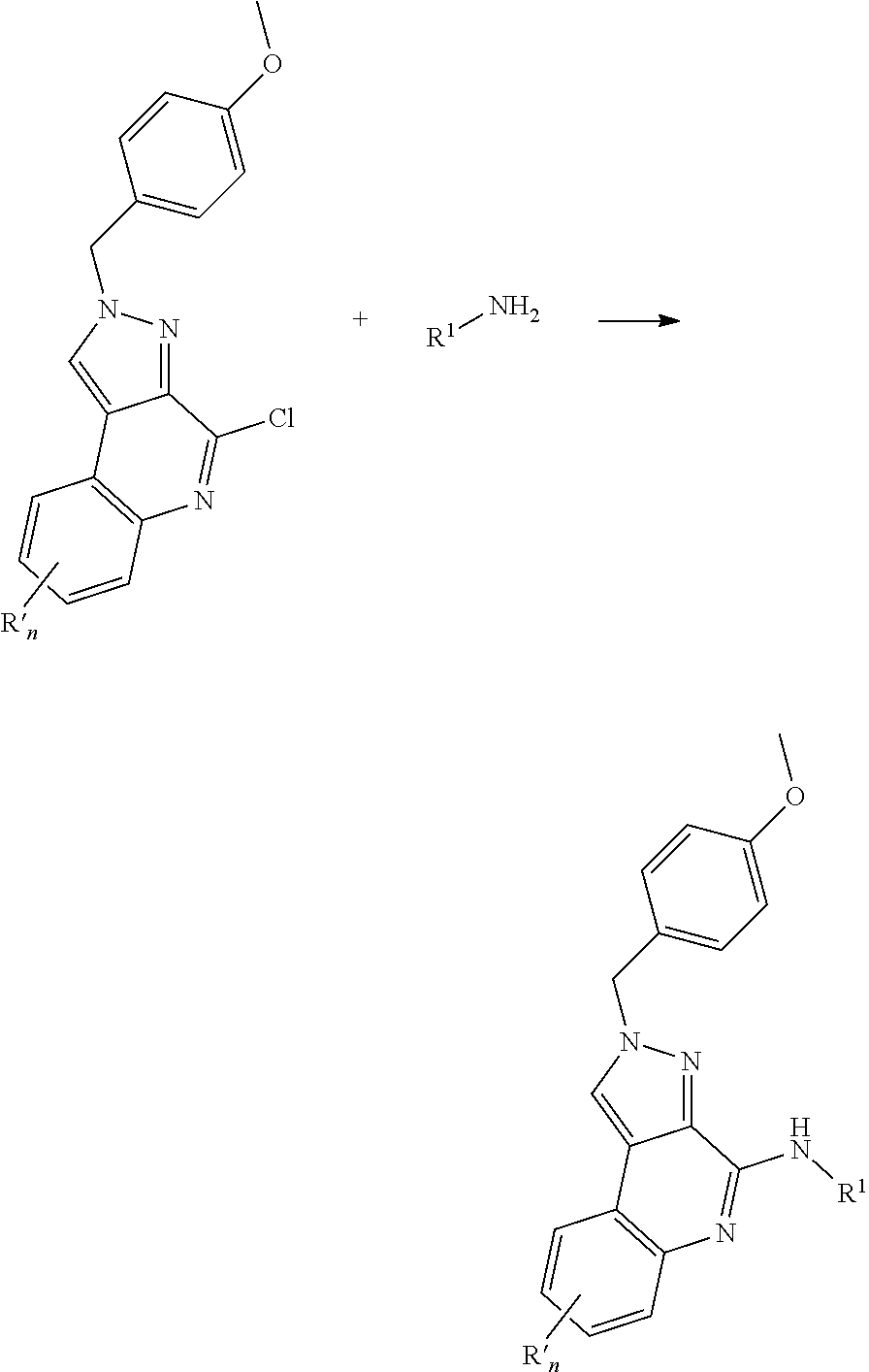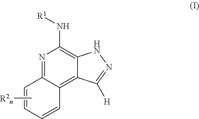 8-methoxy-N-(4-(4-(4-methylpiperazin-1-yl)piperidin-1-yl)phenyl)-2H-pyrazolo[3,4-c]quinolin-4-amine; N-(4-fluoro-3-(methylsulfonyl)phenyl)-8-methoxy-2H-pyrazolo[3,4-c]quinolin-4-amine; N-(3-((dimethylamino)methyl)phenyl)-8-methoxy-2H-pyrazolo[3,4-c]quinolin-4-amine; (4-((8-methoxy-2H-pyrazolo[3,4-c]quinolin-4-yl)amino)phenyl)(4-(4-methylpiperazin-1-yl)piperidin-1-yl)methanone; (3-((8-methoxy-2H-pyrazolo[3,4-c]quinolin-4-yl)amino)phenyl)(morpholino)methanone; N-(3-(tert-butyl)phenyl)-8-methoxy-2H-pyrazolo[3,4-c]quinolin-4-amine; 9-fluoro-N-(4-morpholinophenyl)-3H-pyrazolo[3,4-c]quinolin-4-amine; N-(4-(4-cyclopropylpiperazin-1-yl)phenyl)-9-fluoro-3H-pyrazolo[3,4-c]quinolin-4-amine; 9-fluoro-N-(6-morpholinopyridin-3-yl)-3H-pyrazolo[3,4-c]quinolin-4-amine; 6-((8-methoxy-2H-pyrazolo[3,4-c]quinolin-4-yl)amino)-2,3-dihydrobenzo[b]thiophene 1,1-dioxide; 6-((8-methoxy-2H-pyrazolo[3,4-c]quinolin-4-yl)amino)benzo[b]thiophene 1,1-dioxide; (4-((9-methoxy-3H-pyrazolo[3,4-c]quinolin-4-yl)amino)phenyl)(morpholino)methanone; 9-methoxy-N-(4-(morpholinomethyl)phenyl)-3H-pyrazolo[3,4-c]quinolin-4-amine; 9-methoxy-N-(3-methoxy-4-morpholinophenyl)-3H-pyrazolo[3,4-c]quinolin-4-amine; 9-methoxy-N-(6-morpholinopyridin-3-yl)-3H-pyrazolo[3,4-c]quinolin-4-amine; N-(1,3-dihydroisobenzofuran-5-yl)-9-methoxy-3H-pyrazolo[3,4-c]quinolin-4-amine; 6-((9-methoxy-3H-pyrazolo[3,4-c]quinolin-4-yl)amino)-2,3-dihydrobenzo[b]thiophene 1,1-dioxide; 6-((9-methoxy-3H-pyrazolo[3,4-c]quinolin-4-yl)amino)benzo[b]thiophene 1,1-dioxide; 9-methoxy-N-(4-(4-(4-methylpiperazin-1-yl)piperidin-1-yl)phenyl)-3H-pyrazolo[3,4-c]quinolin-4-amine; 8-methoxy-N-(4-((4-(4-methylpiperazin-1-yl)piperidin-1-yl)methyl)phenyl)-2H-pyrazolo[3,4-c]quinolin-4-amine; 8-methoxy-N-(3-(morpholinomethyl)phenyl)-2H-pyrazolo[3,4-c]quinolin-4-amine; 2-(3-((8-methoxy-2H-pyrazolo[3,4-c]quinolin-4-yl)amino)phenyl)-2-methylpropanenitrile; 3-(4-((8-methoxy-2H-pyrazolo[3,4-c]quinolin-4-yl)amino)phenyl)oxazolidin-2-one; N-(5-cyclopropyl-1H-pyrazol-3-yl)-9-methoxy-3H-pyrazolo[3,4-c]quinolin-4-amine; N-(3-fluoro-4-morpholinophenyl)-9-methoxy-3H-pyrazolo[3,4-c]quinolin-4-amine; N-(3-((dimethylamino)methyl)phenyl)-9-methoxy-3H-pyrazolo[3,4-c]quinolin-4-amine; (4-((9-fluoro-3H-pyrazolo[3,4-c]quinolin-4-yl)amino)phenyl)(morpholino)methanone; 9-fluoro-N-(4-(morpholinomethyl)phenyl)-3H-pyrazolo[3,4-c]quinolin-4-amine; 9-fluoro-N-(3-methoxy-4-morpholinophenyl)-3H-pyrazolo[3,4-c]quinolin-4-amine; N-(4-fluoro-3-(methylsulfonyl)phenyl)-9-methoxy-3H-pyrazolo[3,4-c]quinolin-4-amine; 2-(3-((9-methoxy-3H-pyrazolo[3,4-c]quinolin-4-yl)amino)phenyl)-2-methylpropanenitrile; (2-fluoro-4-((8-methoxy-2H-pyrazolo[3,4-c]quinolin-4-yl)amino)phenyl)(morpholino)methanone; (4-((8-methoxy-2H-pyrazolo[3,4-c]quinolin-4-yl)amino)-2-nitrophenyl)(morpholino)methanone; 8-methoxy-N-(4-(oxazol-2-yl)phenyl)-2H-pyrazolo[3,4-c]quinolin-4-amine; 8-methoxy-N-(4-(oxazol-5-yl)phenyl)-2H-pyrazolo[3,4-c]quinolin-4-amine; N-(4-(4-(tert-butyl)piperazin-1-yl)phenyl)-9-methoxy-3H-pyrazolo[3,4-c]quinolin-4-amine; (4-((9-methoxy-3H-pyrazolo[3,4-c]quinolin-4-yl)amino)phenyl)(4-(4-methylpiperazin-1-yl)piperidin-1-yl)methanone; 3-(4-((9-methoxy-2H-pyrazolo[3,4-c]quinolin-4-yl)amino)phenyl)oxazolidin-2-one; 8-methoxy-N-(pyridazin-4-yl)-2H-pyrazolo[3,4-c]quinolin-4-amine; 8-methoxy-N-(3-(methylsulfonyl)-4-nitrophenyl)-2H-pyrazolo[3,4-c]quinolin-4-amine; 8-(methylthio)-N-(4-morpholinophenyl)-3H-pyrazolo[3,4-c]quinolin-4-amine; N-(3-(methylsulfonyl)phenyl)-8-(methylthio)-3H-pyrazolo[3,4-c]quinolin-4-amine; N-(3,4-dimethoxyphenyl)-8-(methylthio)-3H-pyrazolo[3,4-c]quinolin-4-amine; 1-(4-(4-((8-(methylthio)-3H-pyrazolo[3,4-c]quinolin-4-yl)amino)phenyl)piperazin-1-yl)ethan-1-one; 7-((8-(methylthio)-3H-pyrazolo[3,4-c]quinolin-4-yl)amino)-3,4-dihydroquinolin-2(1H)-one; N-(4-((dimethylamino)methyl)phenyl)-8-(methylthio)-3H-pyrazolo[3,4-c]quinolin-4-amine; N-(2-methylisoindolin-5-yl)-8-(methylthio)-3H-pyrazolo[3,4-c]quinolin-4-amine; 6-fluoro-N-(4-morpholinophenyl)-3H-pyrazolo[3,4-c]quinolin-4-amine; 6-fluoro-N-(3-(methylsulfonyl)phenyl)-3H-pyrazolo[3,4-c]quinolin-4-amine; N-(3,4-dimethoxyphenyl)-6-fluoro-3H-pyrazolo[3,4-c]quinolin-4-amine; 1-(4-(4-((6-fluoro-3H-pyrazolo[3,4-c]quinolin-4-yl)amino)phenyl)piperazin-1-yl)ethan-1-one; 7-((6-fluoro-3H-pyrazolo[3,4-c]quinolin-4-yl)amino)-3,4-dihydroquinolin-2(1H)-one; 8-(methylsulfonyl)-N-(4-morpholinophenyl)-3H-pyrazolo[3,4-c]quinolin-4-amine; 8-methoxy-N-(2-(methylthio)-1H-benzo[d]imidazol-5-yl)-2H-pyrazolo[3,4-c]quinolin-4-amine; 9-methoxy-N-(4-(oxazol-5-yl)phenyl)-3H-pyrazolo[3,4-c]quinolin-4-amine; 9-methoxy-N-(4-(oxazol-2-yl)phenyl)-3H-pyrazolo[3,4-c]quinolin-4-amine; 9-methoxy-N-(4-(4-(methylsulfonyl)piperazin-1-yl)phenyl)-3H-pyrazolo[3,4-c]quinolin-4-amine; 4-(4-((9-methoxy-3H-pyrazolo[3,4-c]quinolin-4-yl)amino)phenyl)morpholin-3-one; (4-((9-methoxy-3H-pyrazolo[3,4-c]quinolin-4-yl)amino)phenyl)(pyrrolidin-1-yl)methanone; 1-(4-(4-((8-(methylsulfonyl)-3H-pyrazolo[3,4-c]quinolin-4-yl)amino)phenyl)piperazin-1-yl)ethan-1-one; N-(3,4-dimethoxyphenyl)-8-(methylsulfonyl)-3H-pyrazolo[3,4-c]quinolin-4-amine; (4-((8-(methylsulfonyl)-3H-pyrazolo[3,4-c]quinolin-4-yl)amino)phenyl)(morpholino)methanone; (4-methylpiperazin-1-yl)(4-((8-(methylsulfonyl)-3H-pyrazolo[3,4-c]quinolin-4-yl)amino)phenyl)methanone; 4-((8-(methylsulfonyl)-3H-pyrazolo[3,4-c]quinolin-4-yl)amino)benzamide; N-(4-(4-(4-methylpiperazin-1-yl)piperidin-1-yl)phenyl)-8-(methylsulfonyl)-3H-pyrazolo[3,4-c]quinolin-4-amine; 1-(4-((9-methoxy-3H-pyrazolo[3,4-c]quinolin-4-yl)amino)phenyl)pyrrolidin-2-one; (4-((9-methoxy-3H-pyrazolo[3,4-c]quinolin-4-yl)amino)phenyl)(4-methylpiperazin-1-yl)methanone; 8-cyclopropyl-N-(3,4-dimethoxyphenyl)-3H-pyrazolo[3,4-c]quinolin-4-amine; 5-((9-methoxy-′3H-pyrazolo[3,4-c]quinolin-4-yl)amino)-2-morpholinobenzonitrile; N-(3,4-dimethoxyphenyl)-8-methyl-3H-pyrazolo[3,4-c]quinolin-4-amine; 1-(4-(4-((8-methyl-3H-pyrazolo[3,4-c]quinolin-4-yl)amino)phenyl)piperazin-1-yl)ethan-1-one; 8-methyl-N-(4-morpholinophenyl)-3H-pyr