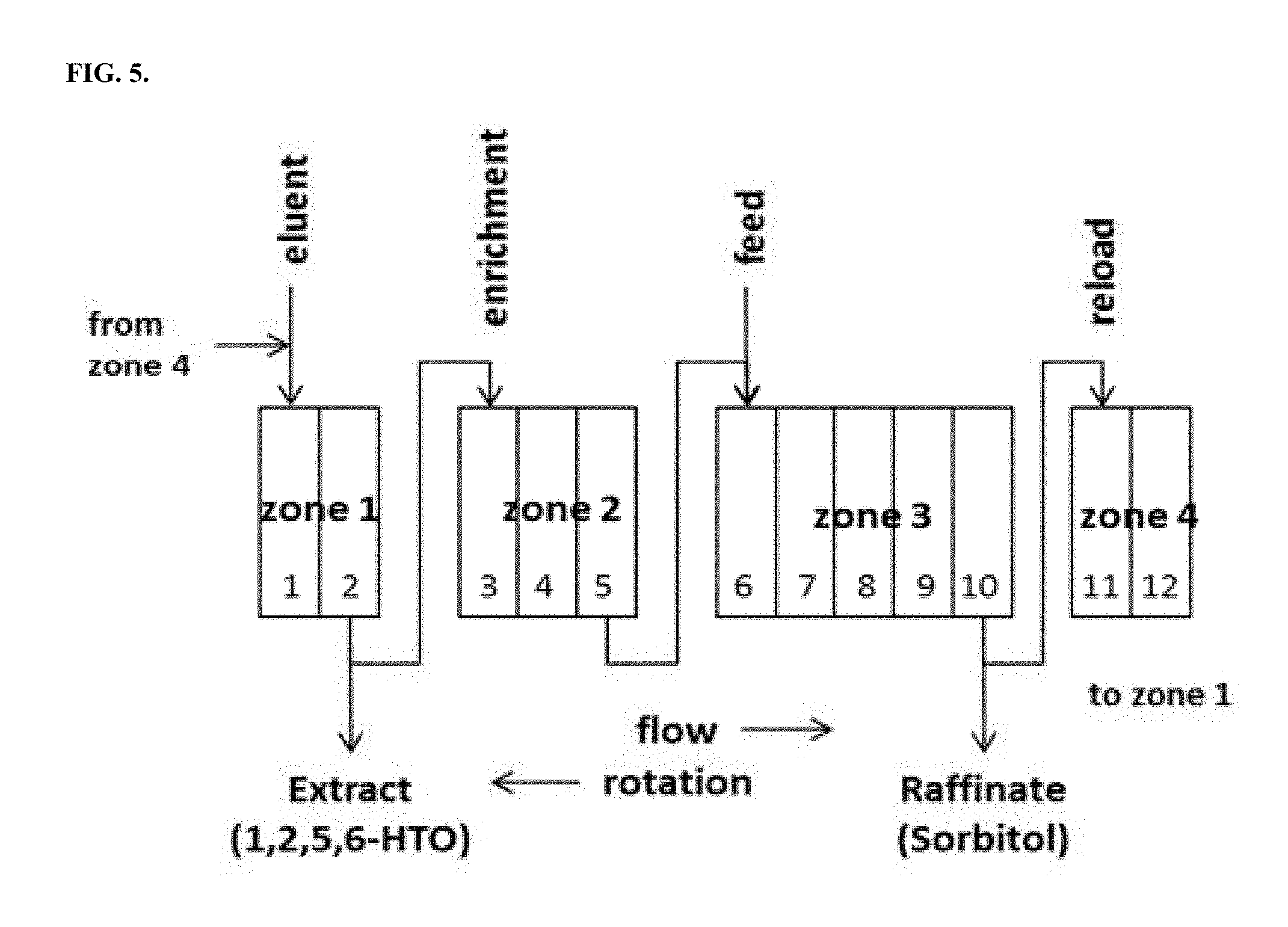 Characteristics of Resin Materials Moisture Particle Crosslink Exchange Retention Surface Particle Size Size Density Capacity Capacity Area Porosity Density Resin Functionality Distribution (μm) (%) (eq./L) (%) (m2/g) (cc/g) (lbs./cu.ft) Amberlite Non- Monodispersed 400 ≤10 n/a 66-73 ≥800 ≥1.4 64 XAD1600N functionalized Dowex 1X8 Type I strong Monodispersed 300 8 1.2 43-48 — — 44 base anion Optipore Non- Gaussian 300-850 ≥10 n/a 50-65 >1100 1.16 21 V493 functionalized Dowex Strong Acid Monodispersed 310 5 >1.5 60-63 — — 51 Monosphere 99/310 *All resins are polystyrene cross-linked with divinyl-benzene. Zone flows translated from pulse test results Zone Zone flows (mL/min) 1 7.00 2 2.50 3 3.25 4 1.00 Pump flows for SMB translated from zone flows from pulse test Pump pump flows (mL/min) pressure (psi) Configuration Eluent 6.00 9-11 2 Enrich 2.50 13 3 Feed 0.75 11.00 5 Reload 1.00 8 2 Yield and purity from the continuous SMB chromatography experiment 1,2,5,6-HTO Sorbitol (unreacted) Yield: 88.0% 99.6% Purity: 99.6% 88.8% Flow rate as written: Zone Flow rate ST Col. vol. BV (#) (mL/min.) (min.) (mL) (mL/mL) 1 6.88 15 43 2.40 Raff. 4.39 15 43 2 2.49 15 43 0.87 3 3.24 15 43 1.13 Prod. 2.24 15 43 4 1.00 15 43 0.35 Flow Rate for each Zone of SMB (ST) Zone Flow (mL/Min.) 1 Raff. 2 3 Prod. 4 ST (min.) 5 min. 20.6 13.2 7.5 9.7 6.7 3.0 15 min. 6.9 4.4 2.5 3.2 2.2 1.0 30 min. 3.4 2.2 1.2 1.6 1.1 0.5 Flow Rate for each Zone of SMB (BV) Zone Flow 1 Raff. 2 3 Prod. 4 BV Low 4.6 2.4 2.2 2.6 2.0 0.6 Med. 6.9 4.4 2.5 3.2 2.2 1.0 High 8.6 5.7 2.9 3.7 2.0 1.7 Section III—Empirical