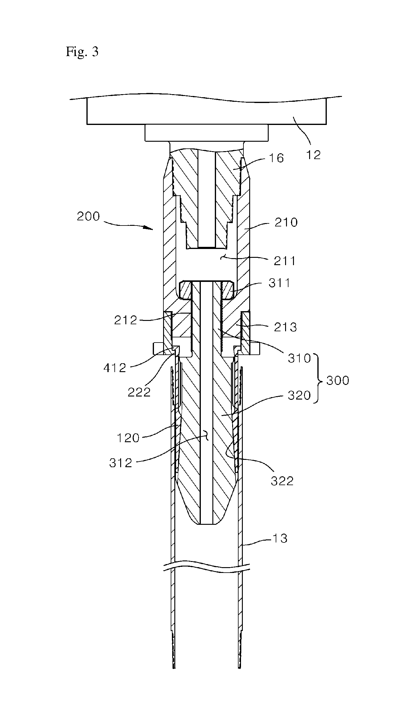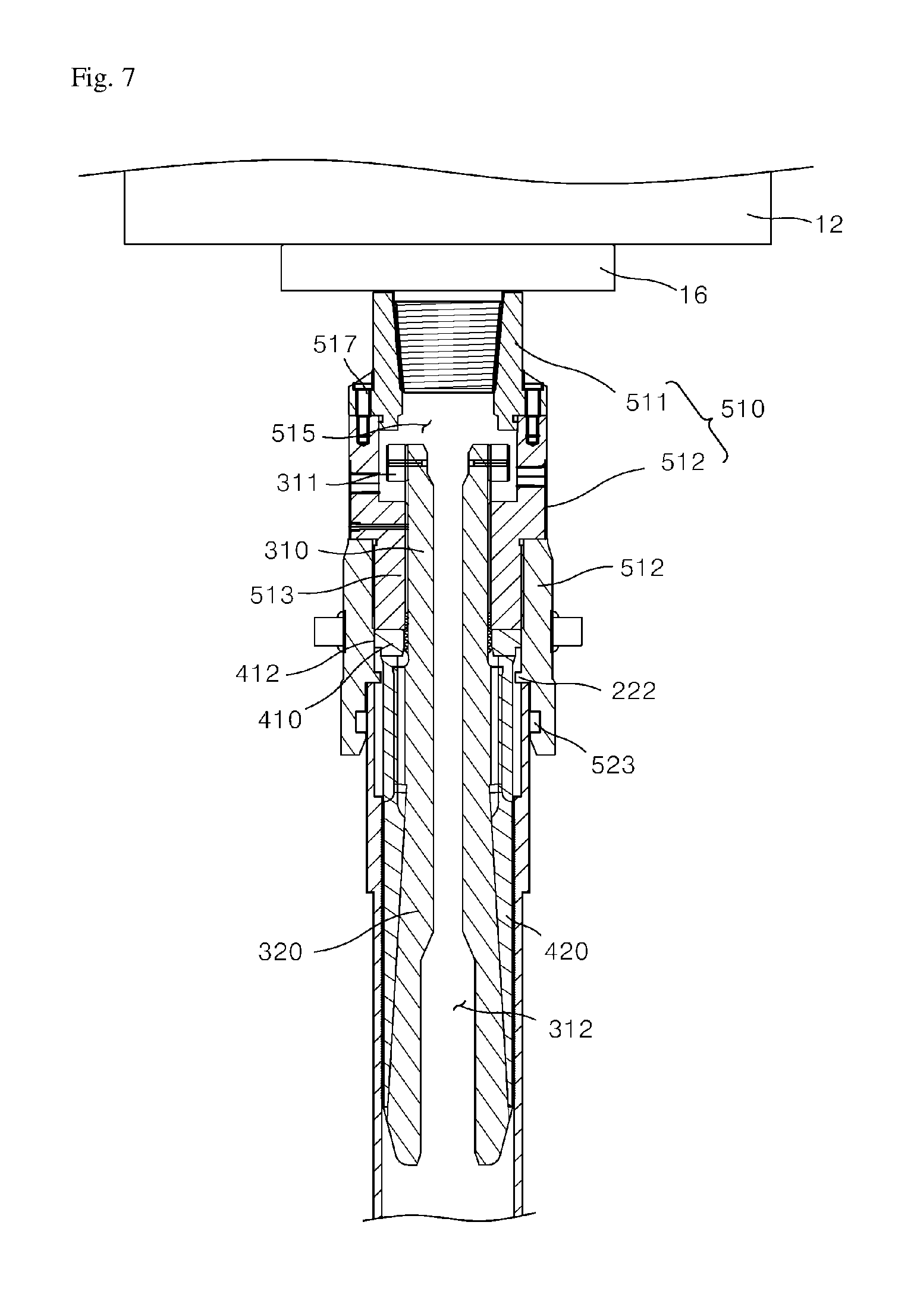 a housing coupled to the driving shaft; a locking member screw-coupled to the housing and configured to move forward and backward according to forward and reverse rotations of the housing coupled to the driving shaft, a plurality of guide grooves extended in a forward-and-backward direction of the locking member being formed on an outer circumference surface of the locking member; a supporting part supported by the housing; and a collet unit extended from the supporting part and inserted into a hollow part of the rod, and including a plurality of collet parts for holding and releasing the rod according to the forward and backward movements of the locking member, the collet parts being introduced into the plurality of guide grooves; wherein a contact surface of each of the guide grooves which contacts an inner surface of the collet part is obliquely formed at a predetermined angle with respect to a center line of the forward-and-backward direction of the locking member and the collet parts approach or are spaced apart from a center of the locking member in accordance with the forward and backward movement of the locking member. 2. The rod clamping device according to 3. The rod clamping device according to the housing includes: a main body which has an end portion coupled to the drive shaft to rotate with the drive shaft and has a fastening hole formed to penetrate therein along a length direction of the lead to be screw-coupled to the locking member; and a sub body which is coupled to the other end portion of the main body and supports the supporting part to be rotatable with respect to a center line of the length direction. 4. The rod clamping device according to