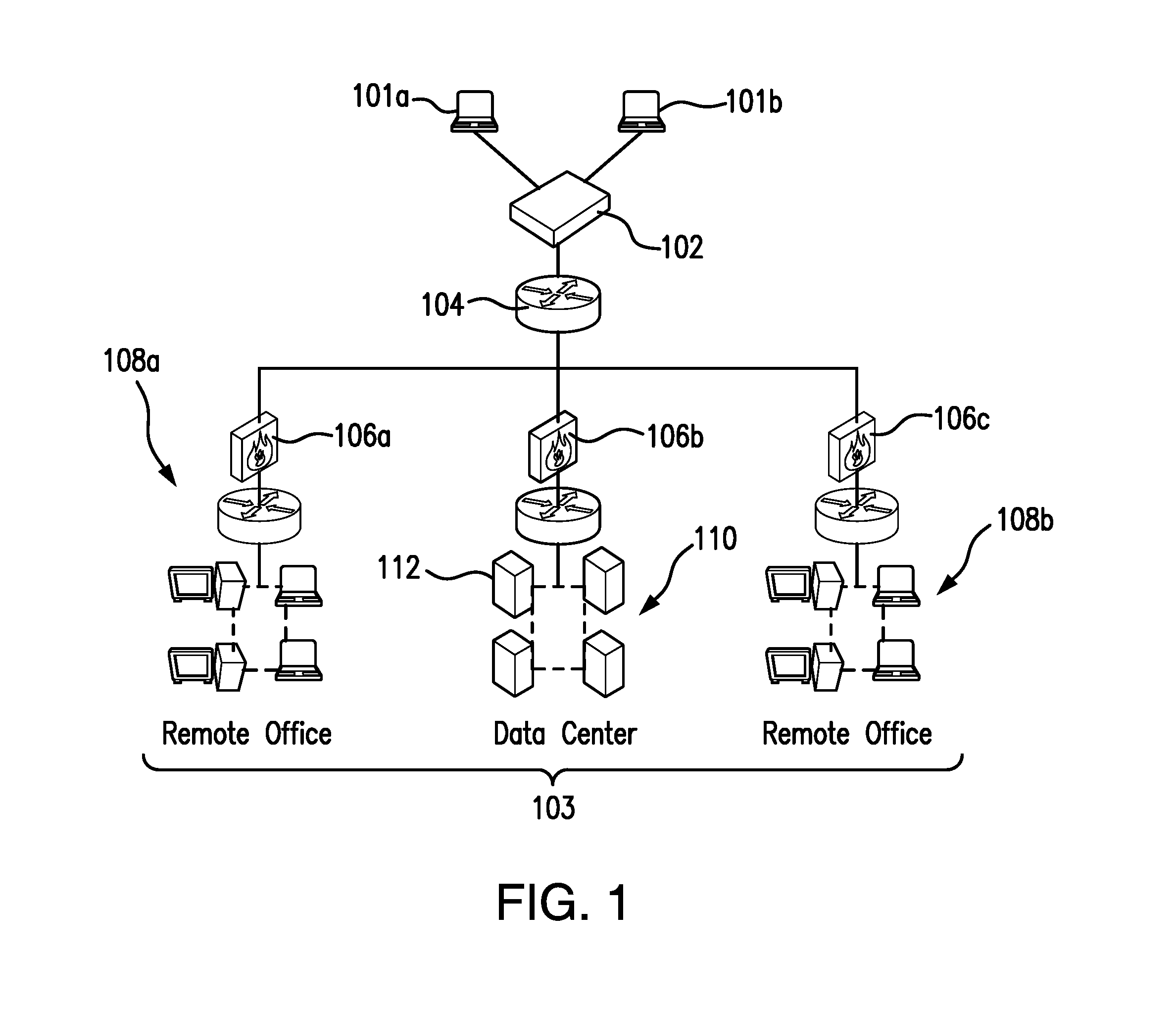 In accordance with an illustrated embodiment of the present invention, reference is now made to FIG. 1 which is an exemplary and non-limiting diagram illustrating a network architecture to which embodiments of the present invention are applicable. In the illustrated embodiment of FIG. 1, one or more external devices 101a, 101b communicate with a protected network 103 and specifically one or more devices within one of the remote offices 108a, 108b and/or a server within a data center 110. In the illustrated example, the external devices 101a, 101b may connect to a destination device using an attack mitigation device 102. The protected network 103 includes a plurality of devices/servers to be protected from malicious threats.