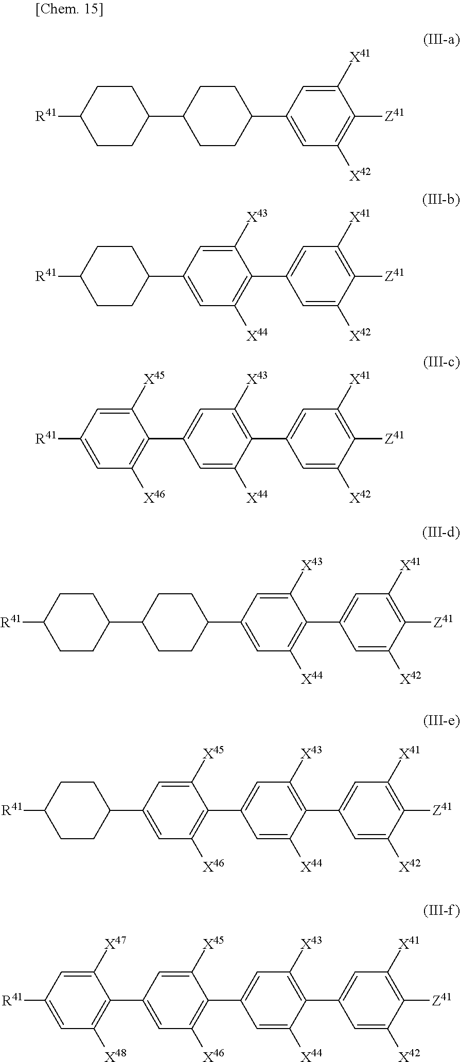(where R41designates an alkyl group having one to ten carbon atoms, an alkoxy group having one to ten carbon atoms, an alkenyl group having two to ten carbon atoms, or an alkenyloxy group having two to ten carbon atoms, X41to X40independently of one another designate hydrogen or fluorine, and Z41designates fluorine, trifluoromethoxy, or trifluoromethyl).