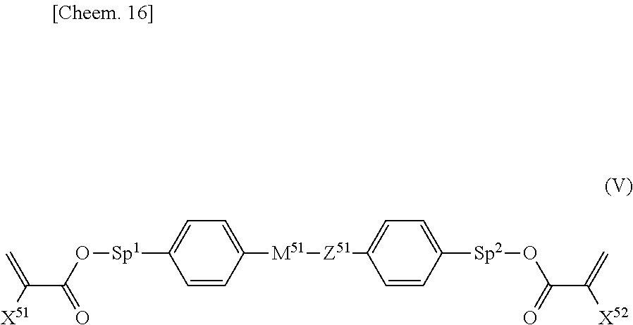 (where X51and X52each independently designate hydrogen or methyl, Sp1and Sp2each independently designate a single bond, an alkylene group having one to eight carbon atoms, or —O—(CH2)s— (where s designates an integer of 2 to 7, and the oxygen binds to the aromatic ring), Z51designates —OCH2—, —CH2O—, —COO—, —OCO—, —CF2O—, —OCF2—, —CH2CH2—, —CF2CF2—, —CH═CH—COO—, —CH═CH—OCO—, —COO—CH═CH—, —OCO—CH═CH—, —COO—CH2CH2—, —OCO—CH2CH2—, —CH2CH2—COO—, —CH2CH2—OCO—, —COO—CH2—, —OCO—CH2—, —CH2—COO—, —CH2—OCO—, —CY1═CY2— (where Y1and Y2each independently designate fluorine or hydrogen), —C≡C—, or a single bond,