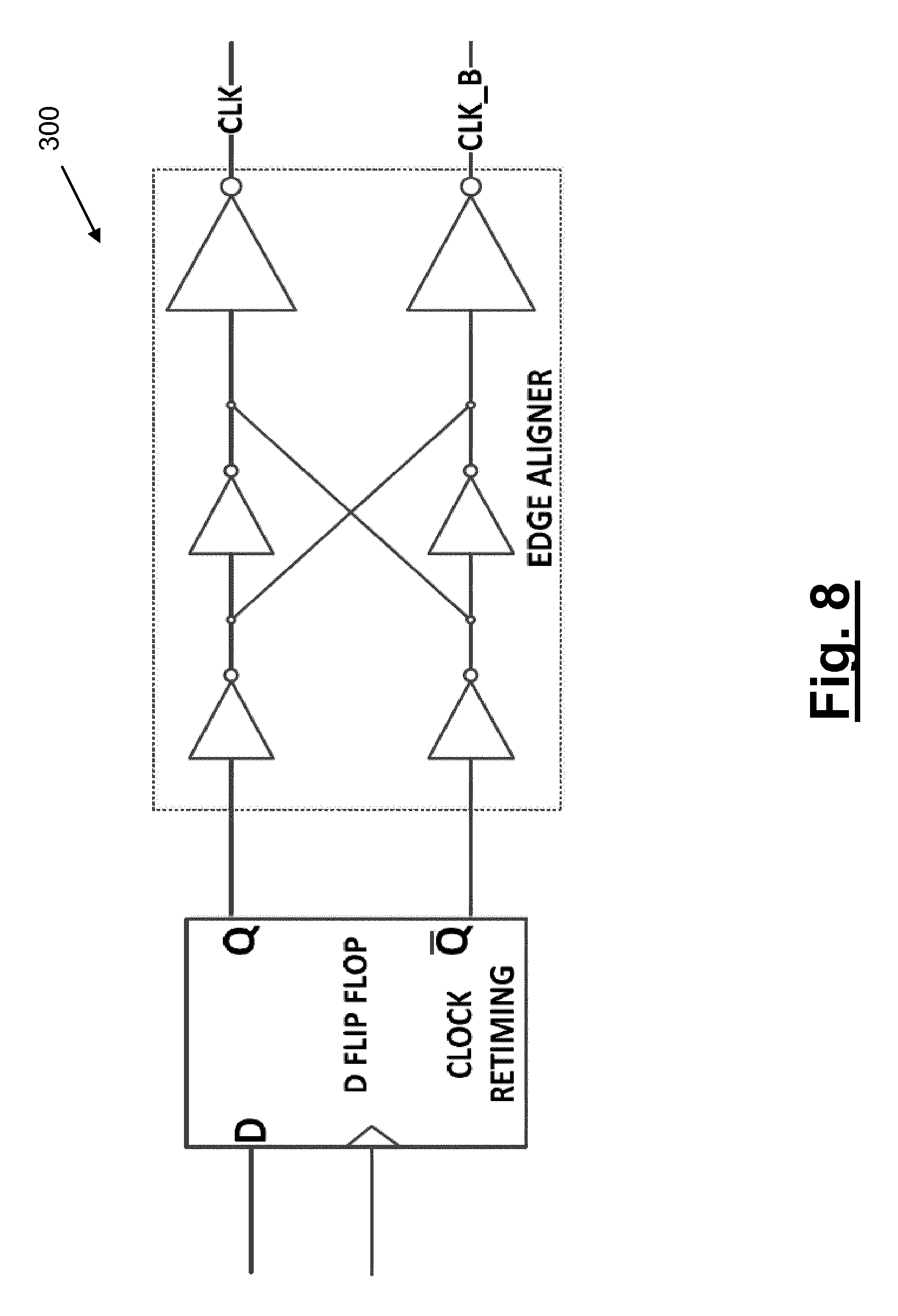 With reference to FIGS. 7 and 8, the gating device 300 and its purpose will now be described. It is used in order to avoid timing issues associated with clock tree and simplify the clock tree design, so to relax the requirements on clock tree network. By this approach, the global constraints are transferred to be handled locally in each pixel. For this purpose, an additional block 300 is introduced at a pixel level, namely a Clock Retiming and Edge Aligner block which is responsible for the following: