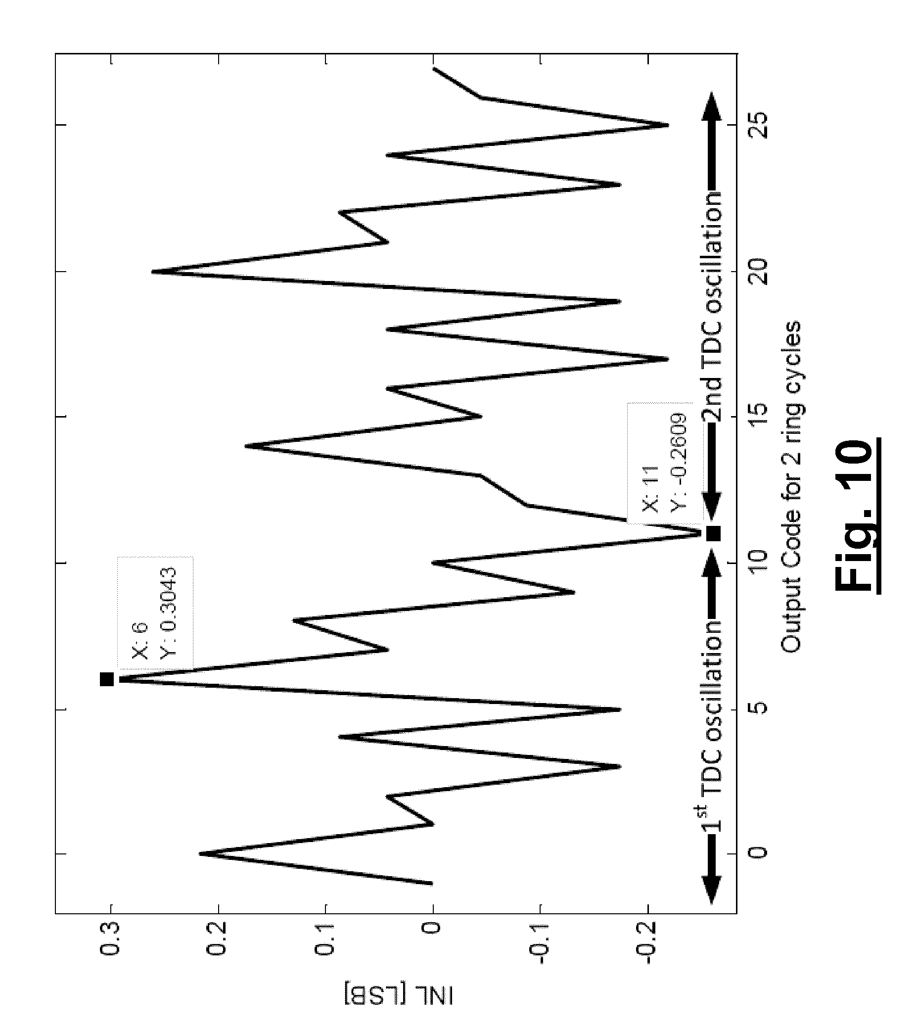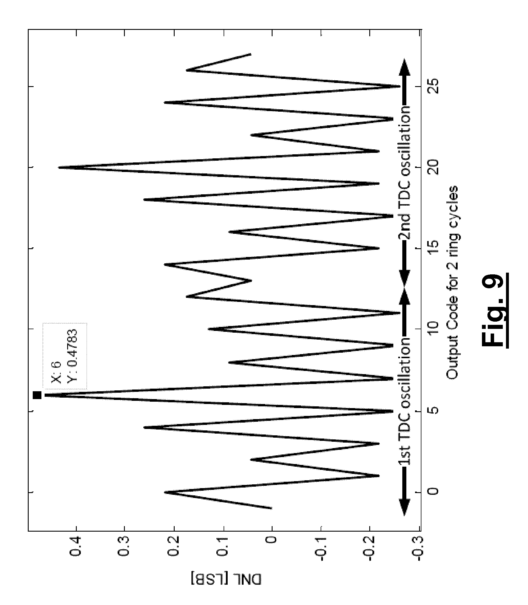 It has been found that the proposed ring oscillator based TDC described above achieves a good linearity with DNL MAX=0.48 LSB and INL MAX=0.3 LSB. The linearity analysis is conducted over 2 TDC oscillations where each oscillation has 14 delay taps. Since the results obtained in both TDC oscillations are coherent with each other, it can be assumed that every cycle of TDC has the similar behavior across all its oscillations. In the DNL plot shown in FIG. 9, we observe that the DNL behavior of both oscillations is similar with a maximum DNL of 0.48 LSB. The maximum DNL occurs at half oscillation or when the propagation returns back to the first delay tap (NAND gate). The INL plot shown in FIG. 10 also shows the same effect. The linearity results are as expected from the TDC architecture and since INL<1 LSB, the accuracy of the system is not limited by TDC linearity.
