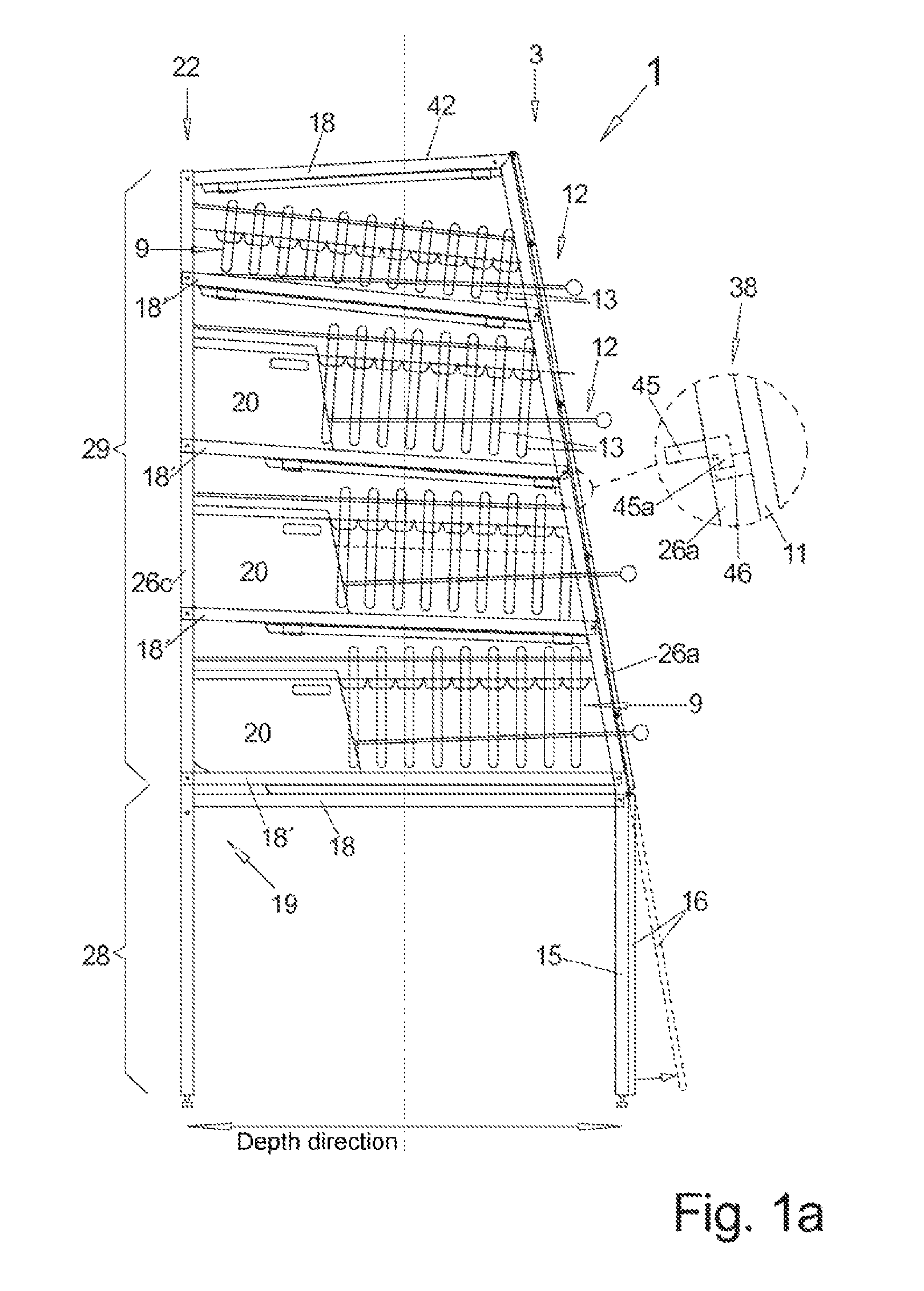 8. The display rack as claimed in claim 1, characterized in that a cover surface of the display rack is closed in particular by a glass plate, and slopes from the front edge to the rear edge, in particular inclined by a maximum of 5°, preferably a maximum of 10°, preferably 15° in relation to the horizontal and/or the front edge is higher than 1.75 m, preferably 1.80 m in relation to the bottom end of the upright struts.