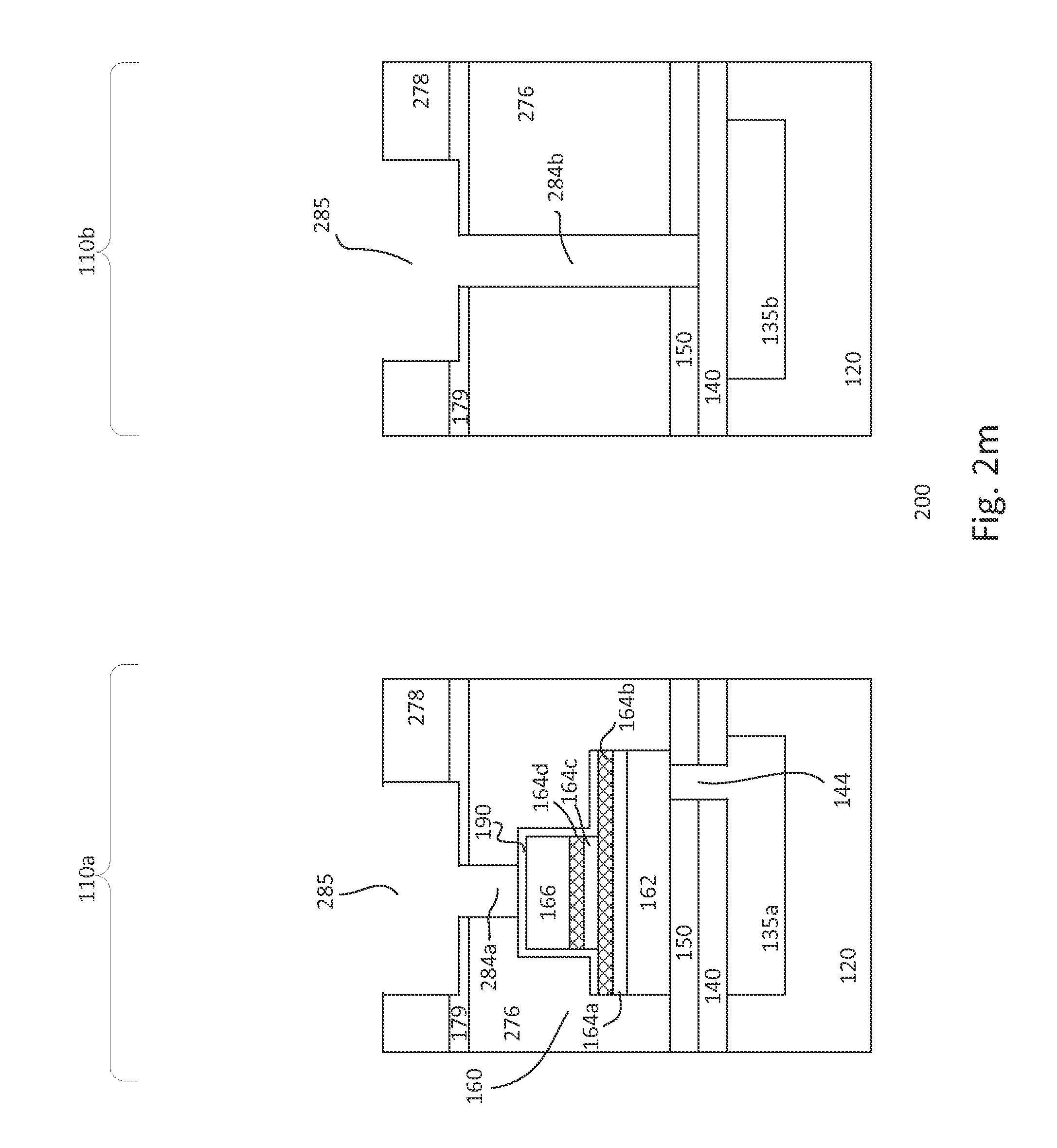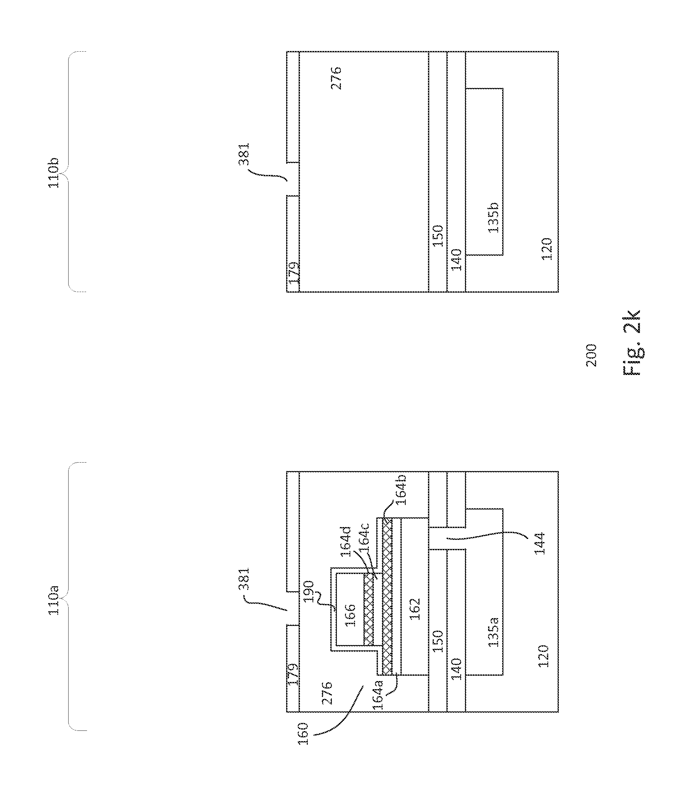 As shown in FIG. 2j, the process continues to form a fifth upper dielectric layer 276. The fifth upper dielectric layer is formed over the fourth upper dielectric layer 274 in the first and second regions and sufficiently covers the top surface of the patterned dielectric liner 190 in the first region. The fifth upper dielectric layer, for example, is TEOS. The fifth upper dielectric layer may be formed by CVD. Other suitable dielectric materials and techniques may be used for forming the fifth upper dielectric layer.