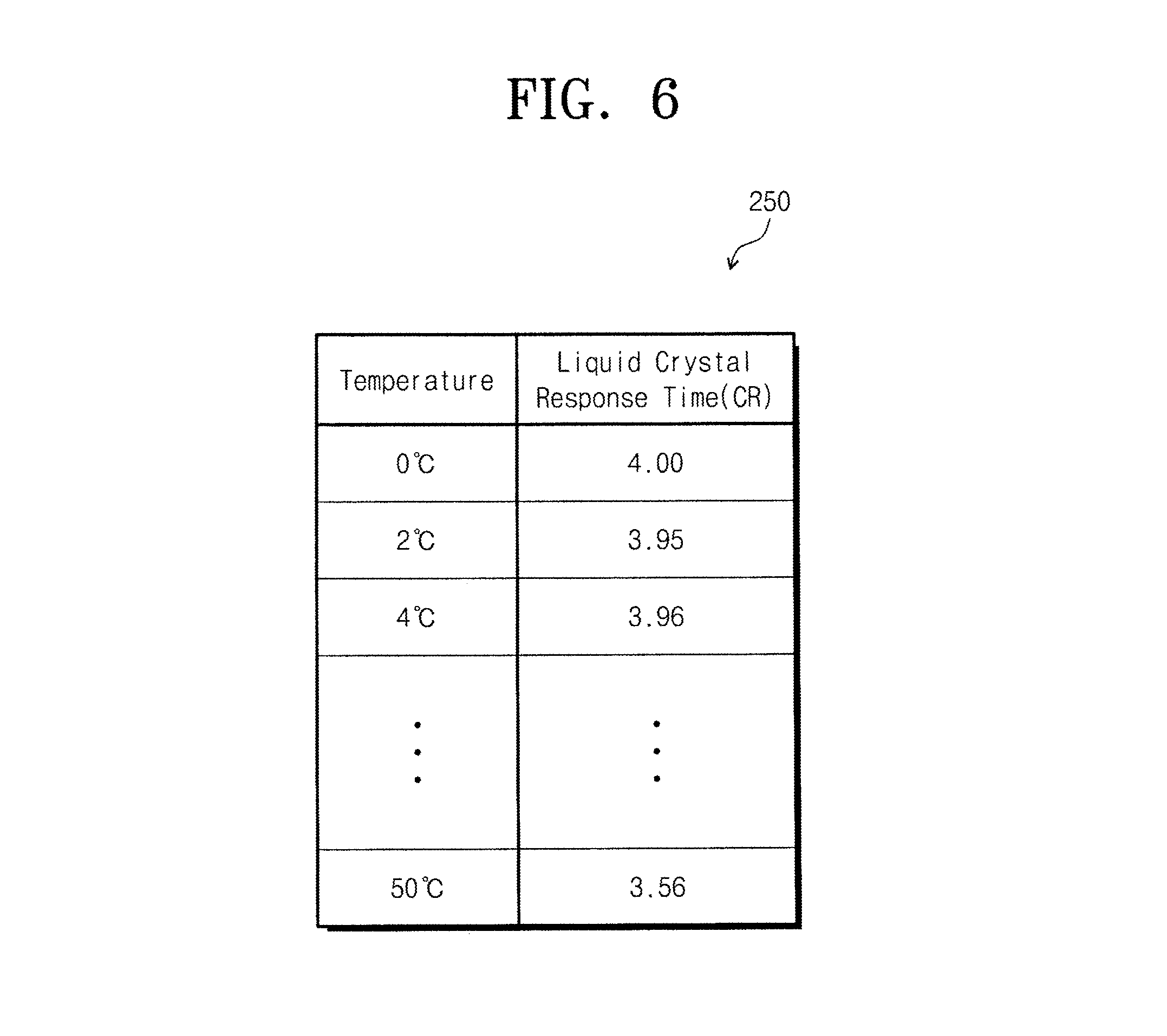 sensing an ambient temperature; storing, in a memory, a liquid crystal response time corresponding to the ambient temperature, and a gamma signal corresponding to the ambient temperature; identifying the liquid crystal response time corresponding to the ambient temperature from the memory; determining a number of fields in one frame section corresponding to the liquid crystal response time; identifying the gamma signal corresponding to the ambient temperature and the number of fields from the memory; and converting an image signal into an image data signal corresponding to the gamma signal, to provide the image data signal to the display panel. 19. The method of the method further comprises outputting a backlight control signal for controlling the backlight source in response to the number of fields.