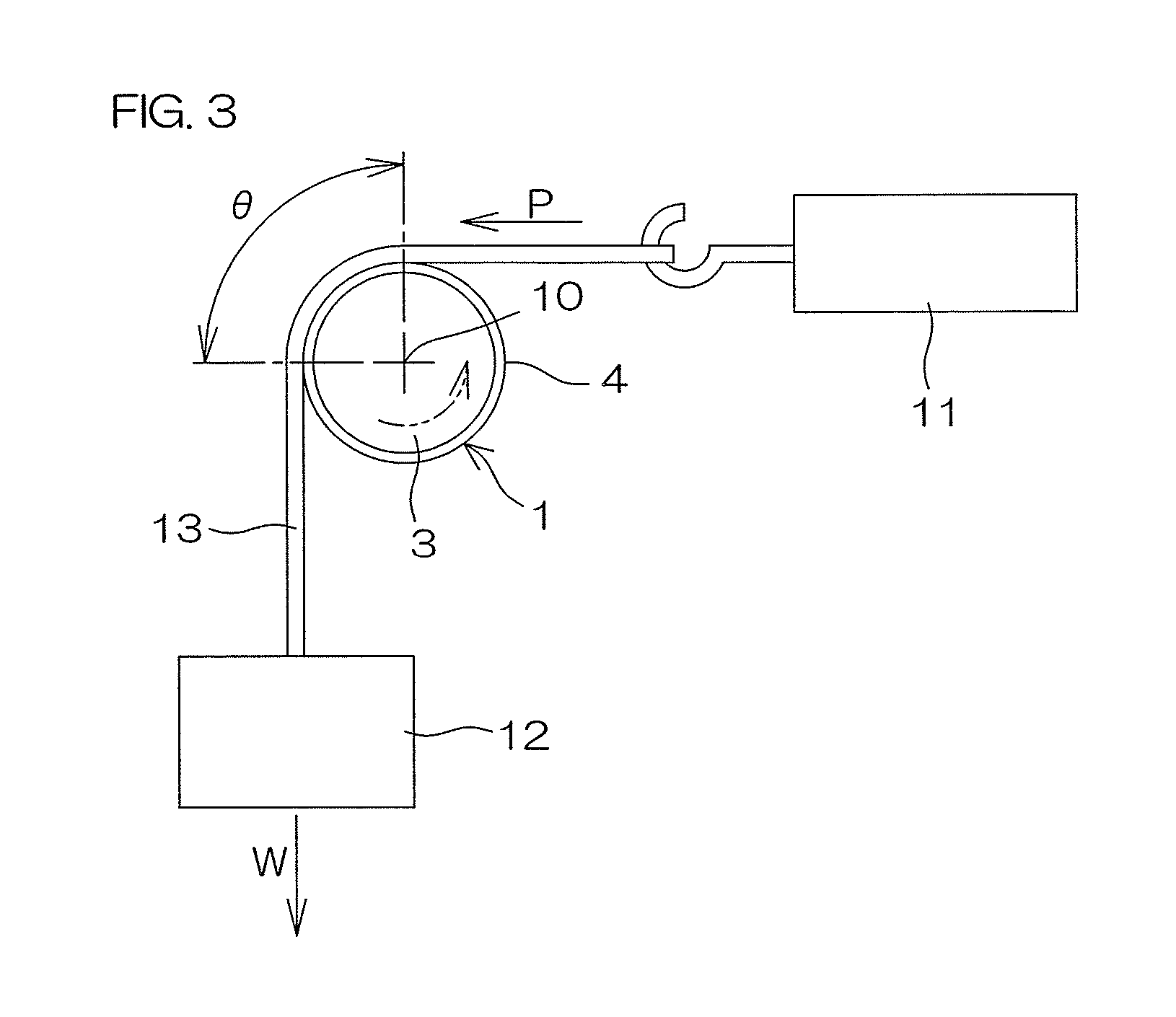 The measurement is performed in an ordinary temperature and ordinary humidity environment at a temperature of 23±1° C. at a relative humidity of 55±1%. <Measurement of Frictional Force> Referring to First, the driving roller 1 is held so as to be rotatable in a direction indicated by a two-dot-and-dash line in Then, a belt 13 is brought into contact with a portion of the outer peripheral surface 4 of the driving roller 1 defined by a center angle θ (degree) about the center axis 10 with a weight 12 attached to one of opposite ends thereof and suspended below the driving roller 1 and with the other end thereof connected to the load meter 11. Subsequently, a load P (N) occurring when the driving roller 1 is rotated at a predetermined speed in the direction indicated by the two-dot-and-dash line is measured by means of the load meter 11, and the friction coefficient μ is calculated based on the measured load P (N), the load W (N) of the weight 12 and the center angle θ (degree) from the following expression (2):