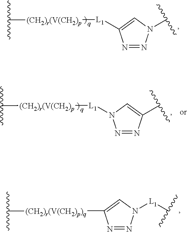 For example, L and/or the linker may comprise at least one isoprenyl derivative unit, preferably two isoprenyl derivative units, each represented by Formula (III), which is preferably recognizable by an isoprenoid transferase, e.g., as part of a product or substrate of the isoprenoid transferase. L and/or the linker may comprise a binding unit formed by a 1,3-dipolar cycloaddition reaction, hetero-Diels-Alder reaction, nucleophilic substitution reaction, non-aldol type carbonyl reaction, addition to a carbon-carbon multiple bond, oxidation reaction, or click reaction. A binding unit may be formed by a reaction between an acetylene and azide, or a reaction between an aldehyde or ketone group and hydrazine or alkoxyamine; such binding units may be represented by Formula (A), (B), (C), or (D). Click chemistry reactions may be carried out under mild conditions, which can be performed in the presence of an antibody without denaturing the antibody. A click chemistry reaction shows high reaction specificity. Therefore, even though antibodies have various functional groups (for example, amines, carboxyls, carboxamides, and guanidiniums), a click chemistry reaction may be performed, for example, without affecting the amino acid side chains of the antibody. A click chemistry reaction between an azide group and an acetylene group, for example, may occur in the presence of an antibody without modifying the amino acid side chain functional groups of the antibody. Further, a click chemistry reaction may precisely target a specific functional group, such as functional groups rarely found in nature, regardless of the nature of the reactants. In some cases, the reactants are selected to improve overall reaction efficiency. For example, an azide-acetylene click chemistry reaction may produce triazole with a high yield (see, e.g., Hia, R K et al., Chem. Rev., 109:5620 (2009); Meldal, M & Tornoe, C W, Chem Rev., 108:2952 (2008); Kolb, H C et al., Angew. Chemie Int. Ed. Engl., 40:2004 (2001), each of which is hereby incorporated by reference). Azide and acetylene functional groups do not exist in natural proteins. Thus, none of the amino acid side chains, N-terminal amines, or C-terminal carboxyls should be affected by a click chemistry reaction that utilizes these functional groups. The L moiety of Formula I and/or the linker may further include a connection unit represented by —(CH2)r(V(CH2)p)q— or —(CH2CH2X)w—, wherein