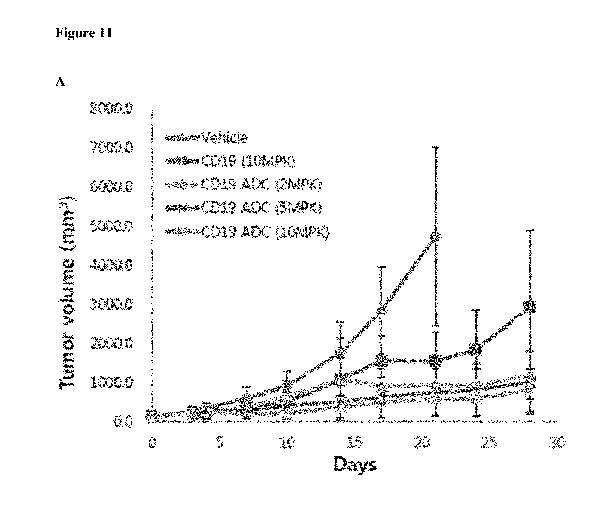 IC50Values Raji K562 IC50(μg/ml) CD19+ (CD19−) CD19mAb >10 >10 CD19ADC_B 0.11 >10 Example 15. ADC14-0610 In Vivo Efficacy