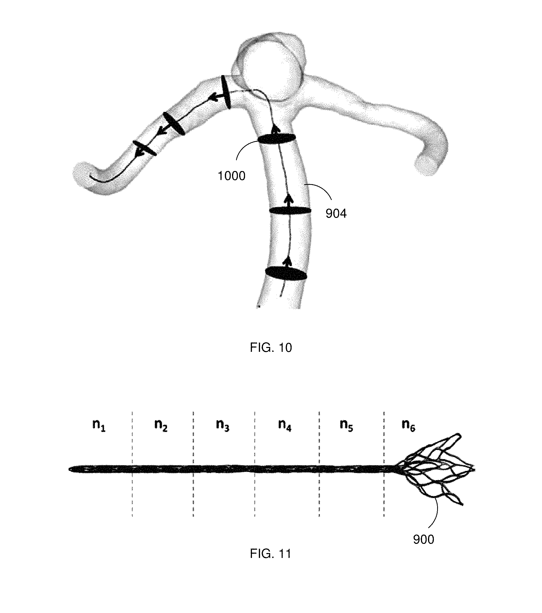 Referring to FIG. 11, after catheter 902 advancement, the geometry 900 may be divided into multiple subsets n1-6, and radial constraints may be applied to each subset to constrain the stent/flow diverter radius to the catheter radius, as given by: