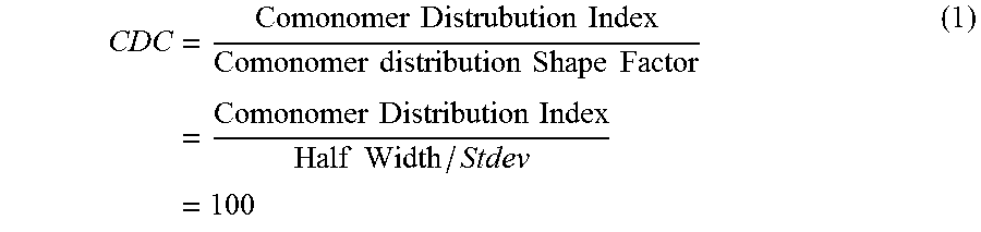 CDC is calculated from comonomer distribution profile by CEF. CDC is defined as Comonomer Distribution Index divided by Comonomer Distribution Shape Factor multiplying by 100 as shown in Equation 1 below: