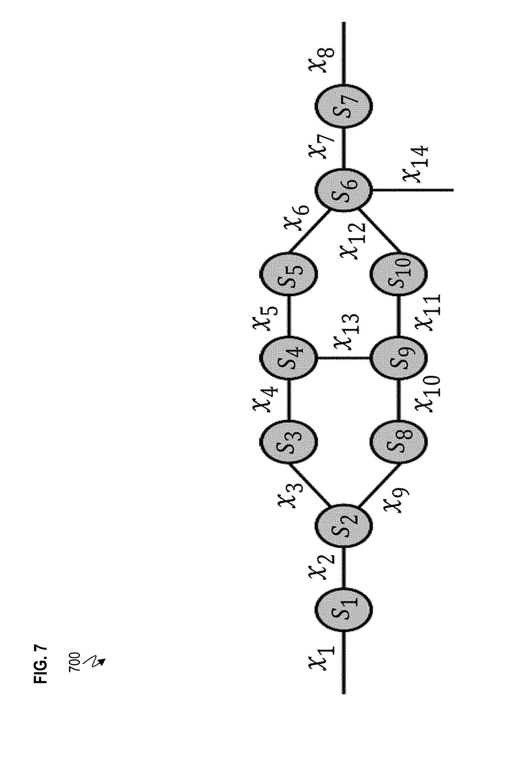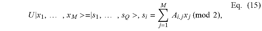 In FIG. 7, each vertex represents a qubit i∈{1, . . . , Q} whereas each edge represents a fermi mode j∈{1, . . . , M}. Experimenters associate syndromes siand fermionic occupation numbers xjwith vertices and edges of the graph respectively. Next is to choose the parity check matrix A in Eq. (15) as the incidence matrix of the graph 700. In other words, a syndrome siequals the sum (modulo two) of the variables xjlocated on edges incident to the vertex i. For example, s1=x1+x2(mod 2), s2=x2+x3+x9(mod 2), etc. Experimenters need to check that A satisfies injectivity condition Eq. (16). As was mentioned above, it suffices to check that the kernel of A contains no vectors of weight 2, 4, or 6, see Eq. (17). A direct inspection shows that the graph 700 shown on FIG. 7 contains no cycles of length 2, 4, or 6 (recall that a subset of edges x is called a cycle if any vertex has even number of incident edges from x). Since A is chosen as the incidence matrix of the graph 700, the equation Ax=0 is equivalent to x being a cycle. Therefore Ax=0 implies |x|≠2, 4, 6 and the injectivity condition Eq. (17) is satisfied. It should be appreciated that this example is very large and therefore the reduction matrix is provided in the simplest terms, i.e., in terms of the graph 700, for ease of understanding. This provides an example for the compression in Table 1 in FIG. 4 for N=3 and M=14 such that Q=10. The circuit measuring needs to be generated from the classical computer 800 in FIG. 8 and then run on the quantum computer 900 in FIG. 9.