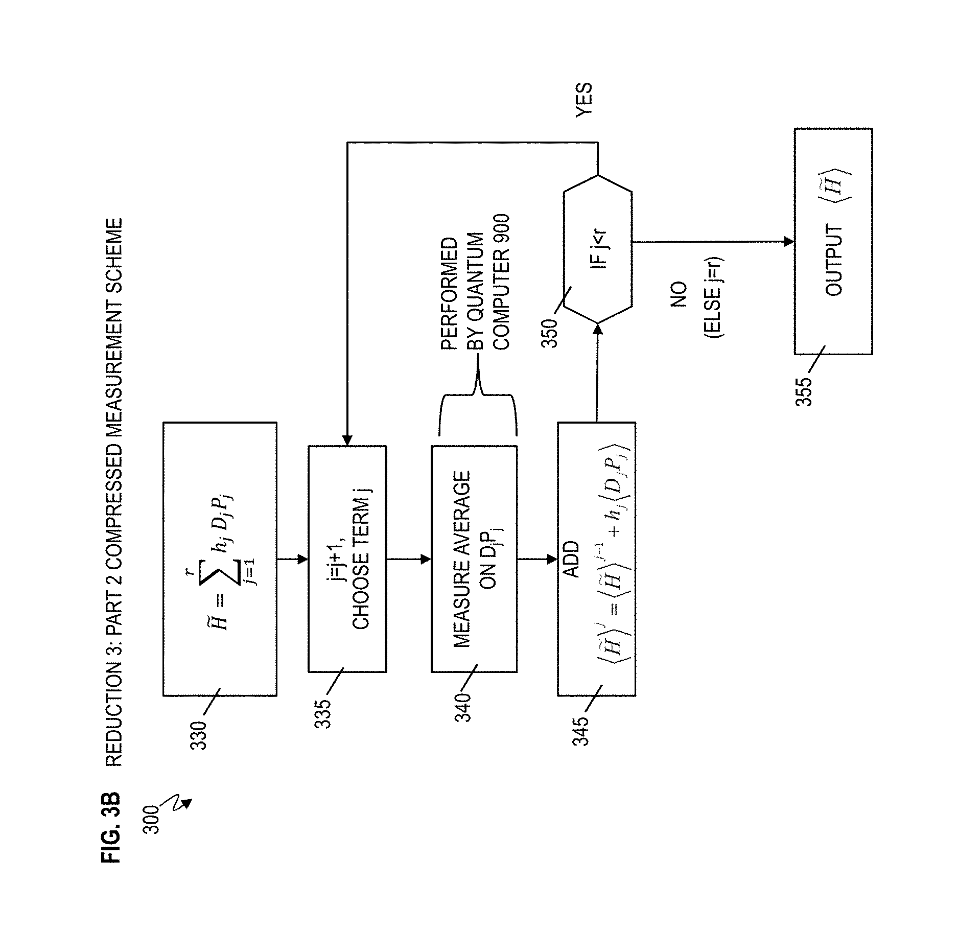 The computational basis is a 0 and 1 for each of the M qubits. The quantum computer 900 is configured to measure an energy of the transformed Hamiltonian with the Q qubits, the quantum computer including a quantum measurement circuit on Q+1 qubits. As a result measured energy measured by the quantum computer 900, the computer 800 is configured to receive measured energy for each compressed term of the transformed Hamiltonian, perform a decoding on the measured energy to obtain measured results of each uncompressed term in the Hamiltonian, and combine the measured results to obtain the energy of the Hamiltonian prior to applying the compression map.