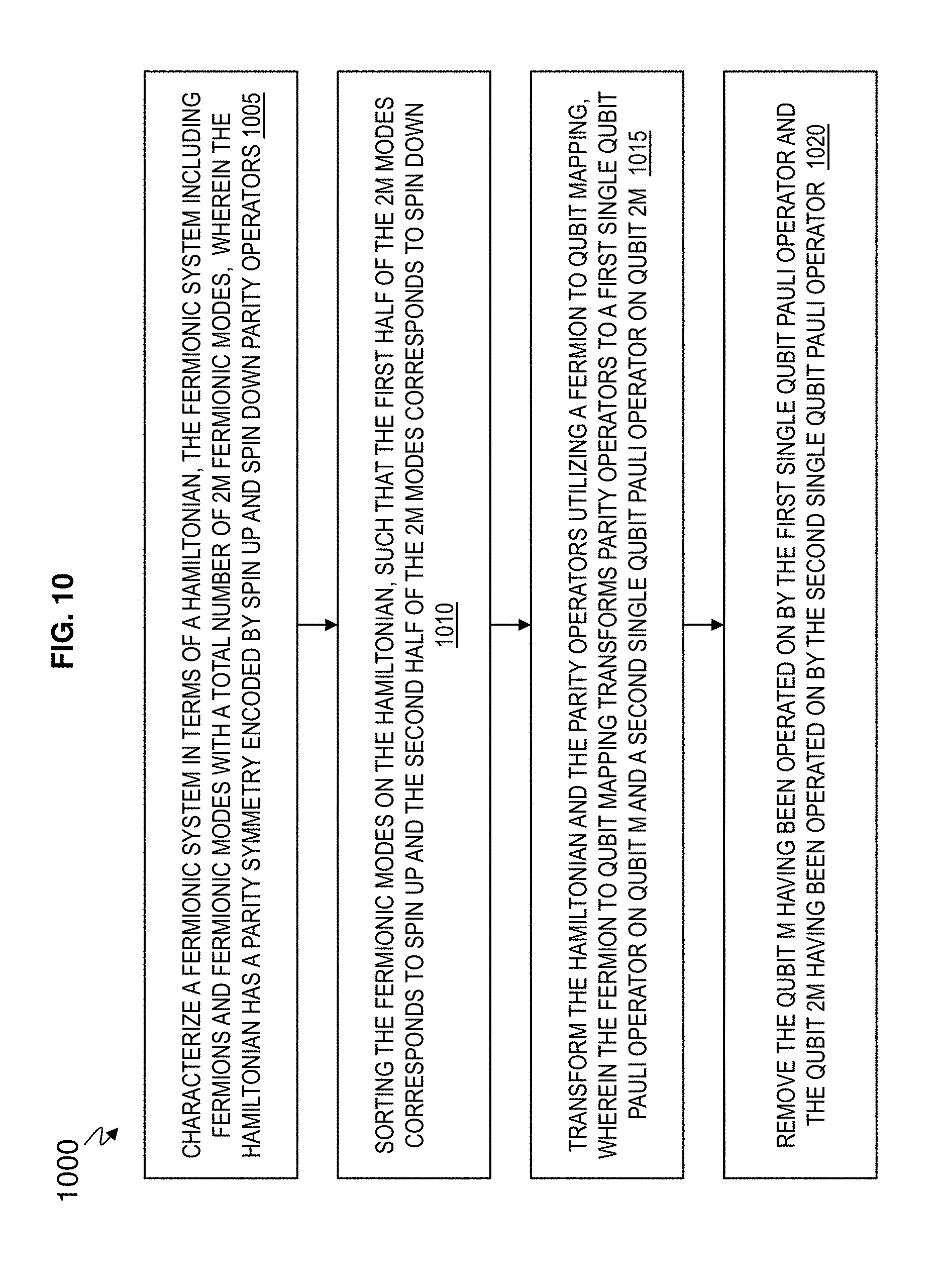 The headings and/or subheadings are discontinued. FIG. 10 is a flow chart of a method 1000 of reducing (Reduction 1) a number of qubits required on (and/or a number of qubit required for simulation on) a quantum computer 900 according to one or more embodiments.
