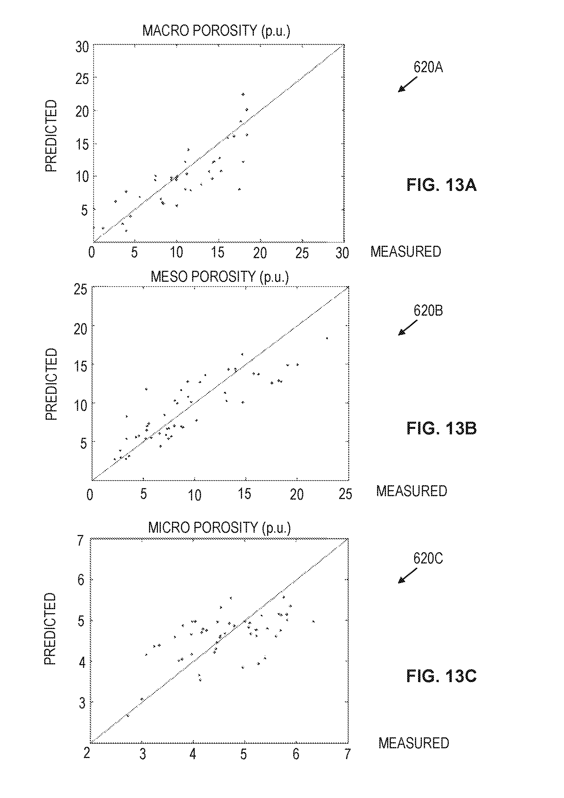 where ϕ is a predicted total porosity value, where rt,gmis a geometric mean of a predicted pore throat size distribution obtained at block 550, and where a, b, and c are predetermined values. The predicted total porosity can be obtained either as an independent prediction parameter, or as a side-product of the predicted pore throat size distribution. For example, in at least some embodiments, ϕ is derived from predicted. pore throat size distributions obtained at block 550. Further, a, b, and c may be derived from measured pore throat size distributions based on regression. In other embodiments, the permeability values derived at block 552 are calculated as: