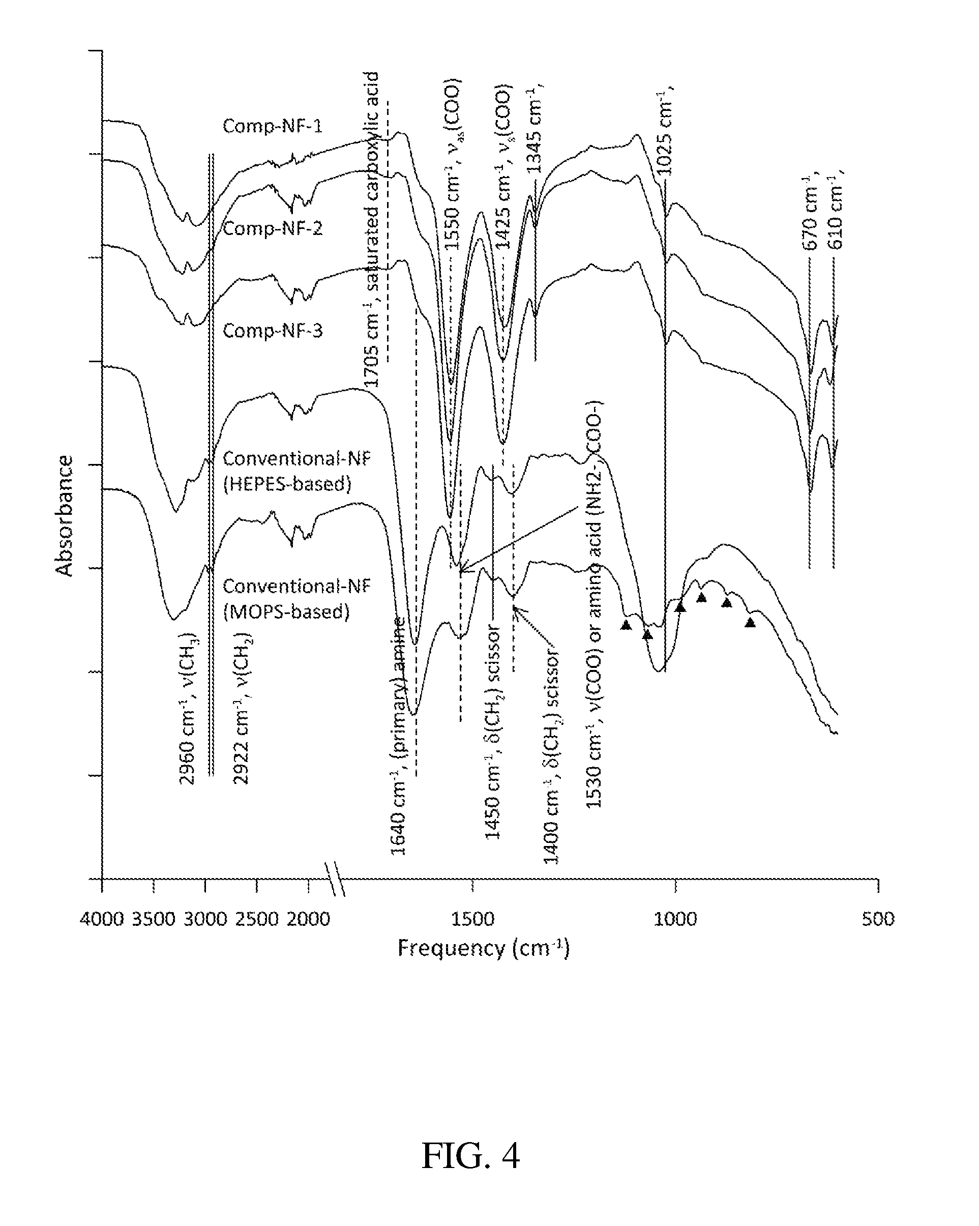 Three complementary NF ZnS samples were selected from Table 1 and their total nitrogen and carbon was analyzed using conventional soil analysis methods. These values were compared to previous NF samples with calibration of gamma Al2O3reference material values. As shown from the plot of nitrogen and carbon analysis in FIG. 3, triplicates of complementary NF ZnS samples had lower nitrogen (0.017%) and carbon (0.308%) composition compared to conventional NF ZnS with nitrogen (0.718%) and carbon (2.28%). The new complementary NF process successfully reduced surface nitrogen and carbon contents in the final nanoparticles at a fraction of 2.3% (N) and 13% (C). Relatively less carbon amount was reduced but the surface should be mostly acetate. The results of FTIR analysis are provided in FIG. 4. As shown, ZnS particles produced by the complementary NF process exhibited a substantial removal of amine peak as compared to ZnS particles produced from the conventional samples. The ZnS particles produced by the complementary NF process also have more well-matched carboxylate peaks at 1425 cm−1and 1550 cm−1. ZnS from conventional NF showed primary amine (1640 cm−1) and shifted carboxylate peaks (1530 cm−1and 1450 cm−1) that could easily be shifted by weak interactions, such as hydrogen bonding.