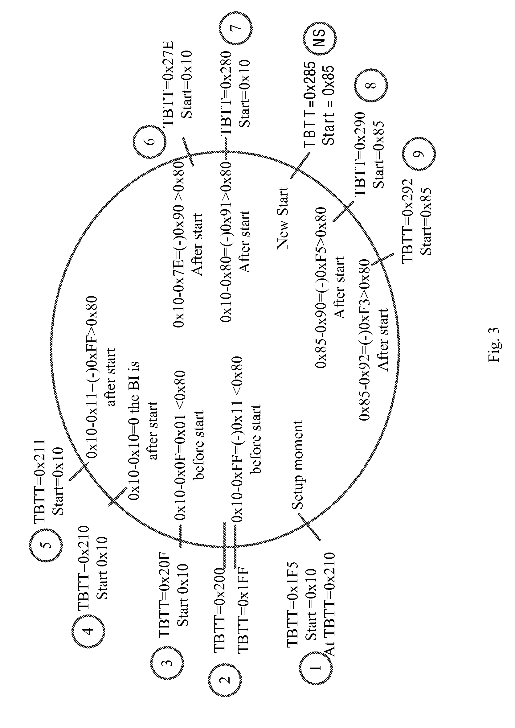 (BI Start Time−lower 4 octets (TBTT)<0) AND (1<ABS (BI Start Time/BI−INT (lower 4 octets (TBTT)/BI))<INT (231/BI)) (2)