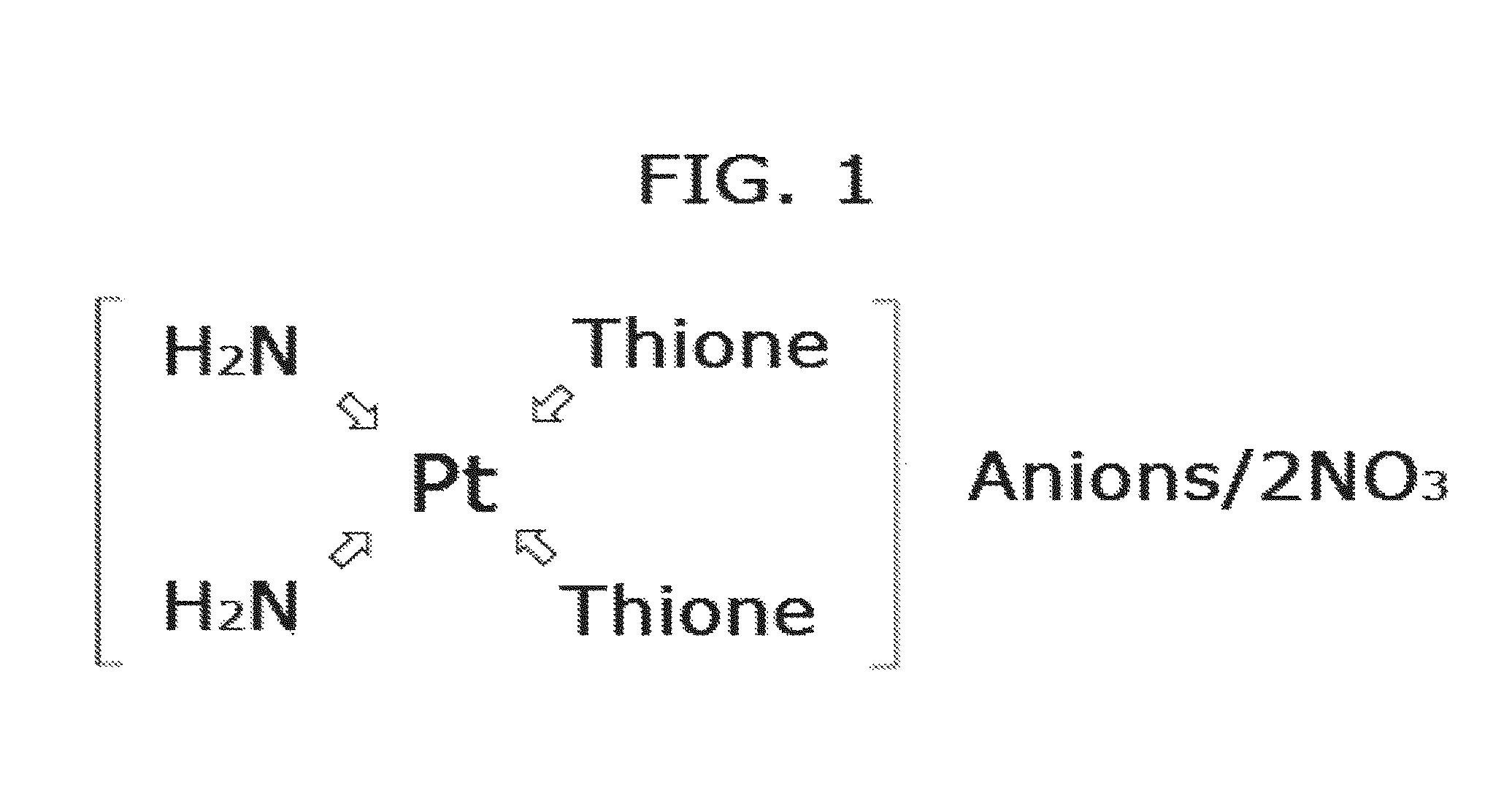 Cisplatin was obtained from Strem Chemical Company, USA. Dimethylsulfoxide-d6and D2O were purchased from Fluka Chemical Co. The thione ligands were prepared according to the procedure mentioned in the literature. See S. Ahmad, A. A. Isab, H. P. Perzanowski. Can. J. Chem. 80 (2002) 1279-1284; and A. A. Isab, S. Ahmad, M. Arab, Polyhedron 21 (2002) 1267-1271, each incorporated herein by reference in their entirety. (3-(4,5-Dimethylthiazol-2-yl)-2,5-diphenyltetrazolium bromide, a yellow tetrazole) was purchased from Sigma Chemical Co, St. Louis, Mo., USA. Compounds 1-10 were prepared by adding 0.17 g (1.0 mmol) AgNO3to the solutions containing (0.15 g, 0.5 mmol) of cis-diaminedichloridoplatinum(II) (cisplatin) in 10 mL water and stirring the mixture for one hour in the dark at room temperature. The solution was filtered to remove silver chloride as solid. Then 1.0 mmol of thione ligands dissolved in 10 mL methanol was added to the filtrates dropwise. After stirring the solution for one hour it was filtered and kept at room temperature. Solid powders were obtained on slow evaporation of the solvent. The CHNS data, melting/decomposition points, and % yield of the synthesized complexes are presented below: cis-[Pt(NH3)2(Imt)2].2NO3(1): M. p. 130-132° C.; Yield 0.248 g, 89%; Analysis. Calc.: C, 12.93%, H, 3.25%, N, 20.10, S, 11.50%; Found: C, 12.48%, H, 3.56%, N, 20.26%, S, 11.37%. IR (ν, cm−1): 3376 (s), 1036 (s), 494 (s), 827 (δ, s), 273 (s). cis-[Pt(NH3)2(MeImt)2].2NO3(2): M. p. 126-128° C.; Yield 0.213 g, 73%; Analysis. Calc.: C, 16.41%, H, 3.79%, N, 19.14, S, 10.95%; Found: C, 16.46%, H, 3.73%, N, 19.06%, S, 11.06%. IR (ν, cm−1): 3481 (s), 1028 (s), 501 (s), 823 (δ, s), 287 (s). cis-[Pt(NH3)2(Me2Imt)2].2NO3(3): M. p. 73-75° C.: Yield 0.214 g, 70%; Analysis. Calc.: C, 19.57%, H, 4.27%, N, 18.16, S, 10.45%, Found: C, 19.41%, H, 4.22%, N, 18.10%, S, 10.34%. IR (ν, cm−1): 1118 (s), 491 (s), 825 (δ, s), 280 (s). cis-[Pt(NH3)2(Et2Imt)2].2NO3(4): M. p. 111-113° C.; Yield 0.211 g, 64%; Analysis. Calc.: C, 25.11%, H, 5.120%, N, 16.73, S, 9.58%; Found: C, 25.410%, H, 5.22%, N, 16.97%, S, 9.84%. IR (ν, cm−1): 1079 (s), 492 (s), 837 (5, s), 268 (s). cis-[Pt(NH3)2(PrImt)2].2NO3(5): M. p. 125-127° C.; Yield 0.231 g, 72%; Analysis. Calc.: C, 22.46%, H, 4.71%, N, 17.48, S, 9.99%; Found: 10.07%. IR (ν, cm−1): 3462 (s), 1048 (s), 501 (s), 827 (δ, s), 282 (s). cis-[Pt(NH3)2(iPrImt)2].2NO3(6): M. p. 138-140° C.; Yield 0.263 g, 82%; Analysis. Calc.: C, 22.46%, H, 4.71%, N, 17.48, S, 9.99%; Found: C, 21.990%, H, 4.49%, N, 17.35%, S, 9.62%. IR (ν, cm−1): 1078 (s), 508 (s), 840 (δ, s), 283 (s). cis-[Pt(NH3)2(iPr2Imt)2].2NO3(7): M. p. 119-121° C.; Yield 0.178 g, 490%; Analysis. Calc.: C, 29.79%, H, 5.83%, N, 15.44, S, 8.84%; Found: C, 29.29%, H, 5.62%, N, 15.65%, S, 8.77%. IR (ν, cm−1): 1062 (s), 520 (s), 824 (δ, s), 274 (s). cis-[Pt(NH3)2(Diaz)2].2NO3(8): M. p. 112-114° C.; Yield 0.254 g, 87%; Analysis. Calc.: C, 16.41%, H, 3.79%, N, 19.14, S, 10.95%; Found: C, 16.78%, H, 3.92%, N, 19.45%, S, 10.89%. IR (ν, cm−1): 3459 (s), 1070 (s), 507 (s), 811 (δ, s), 268 (s). cis-[Pt(NH3)2(EtDiaz)2].2NO3(9): M. p. 86-88° C.; Yield 0.211 g, 66%; Analysis. Calc.: C, 22.46%, H, 4.71%, N, 17.48, S, 9.99%, Found: C, 22.32%, H, 4.47%, N, 17.53%, S, 9.68%. IR (ν, cm−1): 3428(s), 1121 (s), 499 (s), 827 (δ, s), 291 (s). cis-[Pt(NH3)2(Diap)2].2NO3(10): M. p. 155-157° C.; Yield 0.274, 89%; Analysis. Calc.: C, 19.57%, H, 4.27%, N, 18.26, S, 10.45%, Found: C, 18.89%, H, 4.34%, N, 18.67%, S, 10.49%. IR (ν, cm−1): 3237(s), 1066 (s), 502 (s), 824 (δ, s), 276 (s). Synthesis. For the preparation of complexes, cisplatin was first converted into nitrate form by addition of two equivalents of AgNO3to cisplatin. The nitrate species was then reacted with thione (L) ligands in a 1:2 molar ratio. The reaction yielded the colored complexes of the general formula, cis-[Pt(NH3)2(L)2].2NO3in high yields. The observed values of elemental (CHNS) analysis of these complexes are consistent with the suggested compositions. Elemental analysis of carbon, hydrogen, nitrogen and sulfur were performed on Perkin Elmer Series 11 (CHNS/O), Analyzer 2400. The solid state FTIR spectra of the ligands and their platinum(II) complexes were recorded on a NICOLET 6700 FTIR using diamond ATR over the range 4000-400 cm−1. The1H and13C NMR spectra in DMSO-d6and D2O were carried out on a JEOL JNM-LA 500 NMR spectrometer at 500.00 MHz and 125.65 MHz operating frequency respectively. The13C NMR spectra were recorded with1H broadband decoupling at 297 K. The conditions of the spectral were 32 K data points, 0.963 acquisition time, 3.2 s pulse delay and a 5.75 μs pulse width for1H NMR, and 32 K data points, 0.963 s acquisition time, 2.5 s pulse delay and a 5.12 μs pulse width for13C NMR. The chemical shifts were measured relative to Tetramethylsilane (TMS). IR Spectroscopy. The selected Infrared absorption frequencies of the free ligands and their platinum(II) compounds are listed in Table S1. Three characteristic vibrational bands are usually observed in the IR spectra of thione complexes, which include, ν(C═S) vibration, which occurs around 1200 and 600 cm−1, the N—H stretching near 3200 cm−1and M-sulfur stretching band. The presence of ν(N—H) and ν(C═S) bands in all complexes prove the presence of thione ligands in the complexes in the solid state. The spectra of all free ligands display a band around 600 cm−1as well as 1200 cm−1that belong to ν(C═S) stretching. See, S. Ahmad et al.; A. A. Isab et al.; and B. P. Kennedy, A. B. P. Lever, Can. J. Chem. 50 (1972) 3488-3507, each incorporated herein by reference in their entirety. These bands shifted toward lower wave number upon complexation in agreement with our suggestion that sulfur atom is bonded to metal centre and the double bond character of C═S bond has been reduced. In order to investigate metal-sulfur stretching frequencies of the synthesized com