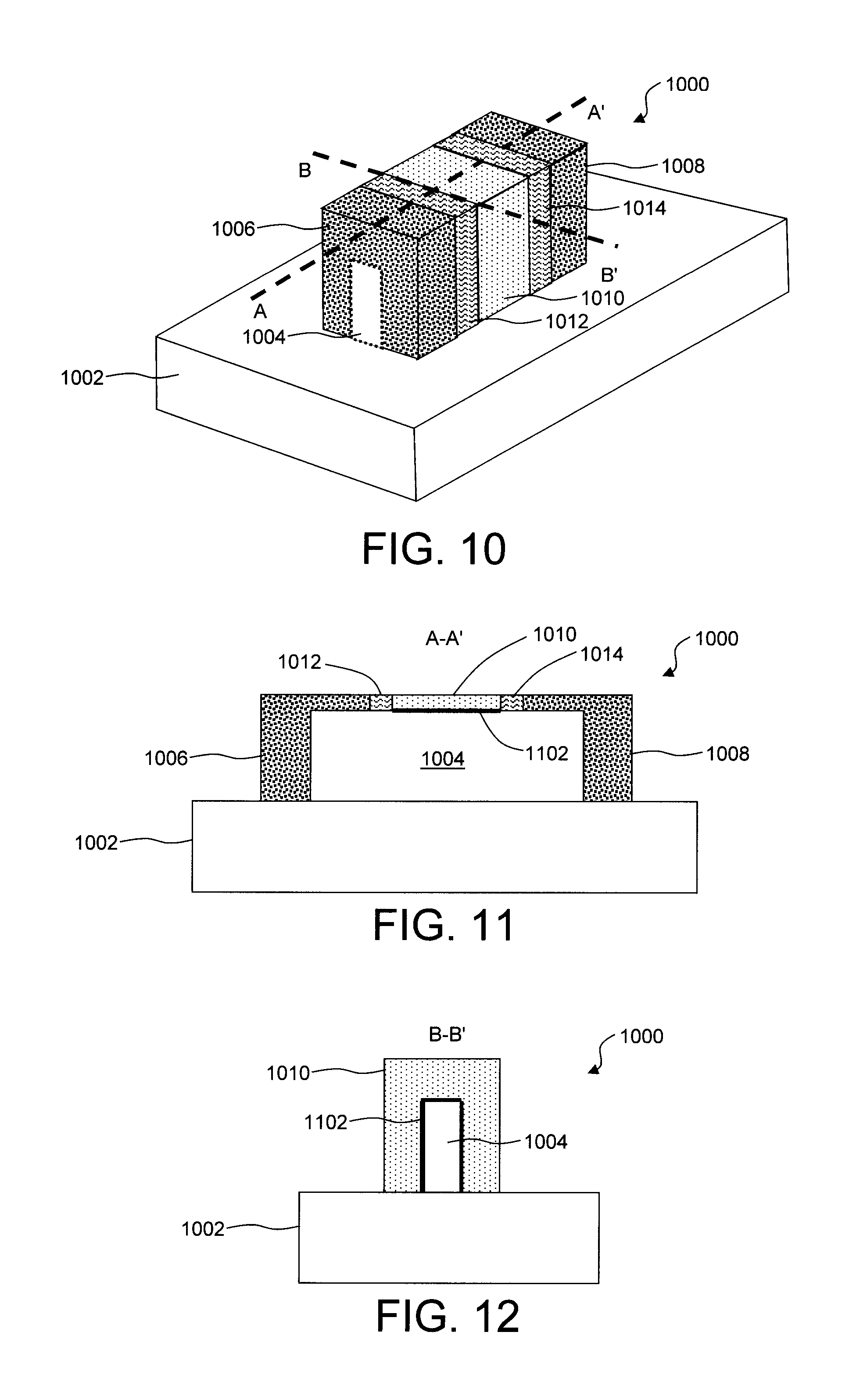FIG. 12 is another cross-sectional view of the exemplary finFET of FIG. 10 according to an embodiment of the present invention;