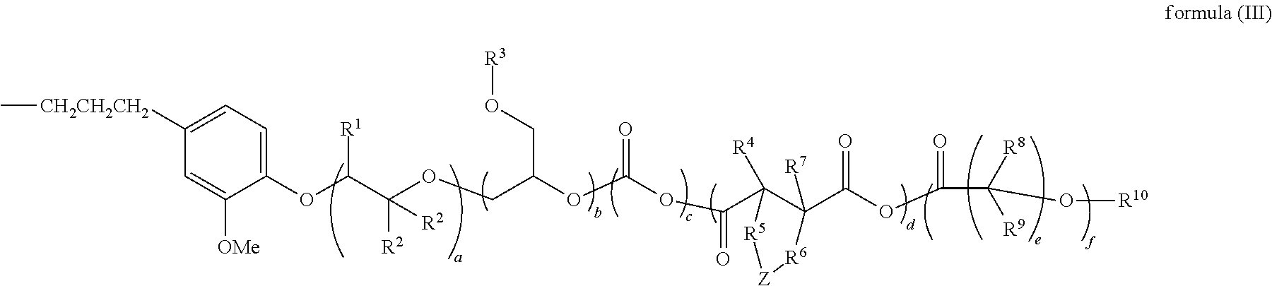 In Macromol. Symp. 2010, 293, 15-19, Luinstra et al. also describe polyether-like structures where the eugenol allyl group remains stable in order to subject said structures to an AD MET polymerization. Said authors employ a substitution reaction of diethylene glycol ditosylate with two mol of eugenol. However, a eugenol-containing polymer is not described.