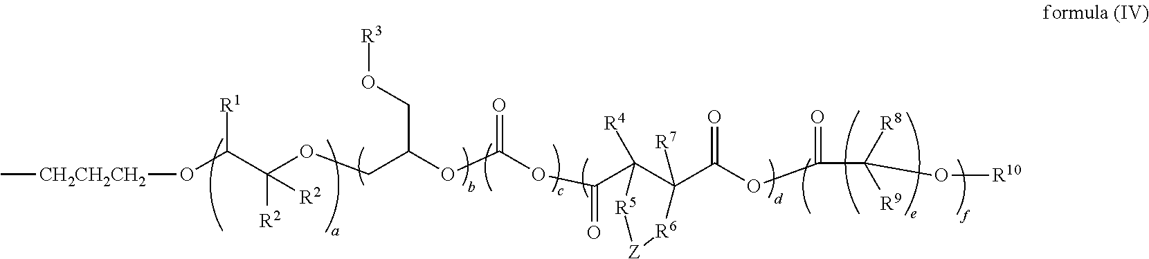 and with the proviso that the different monomer units and the fragments with the indices a, b and f may be in a blockwise structure with one another, where individual blocks may also occur multiple times and may be randomly distributed among one another, or else are subject to a random distribution and further are freely permutable with one another, in the sense that they may be arranged in any desired sequence, subject to the restriction that neither of the groups with the indices c and d may follow itself or the respective other group,