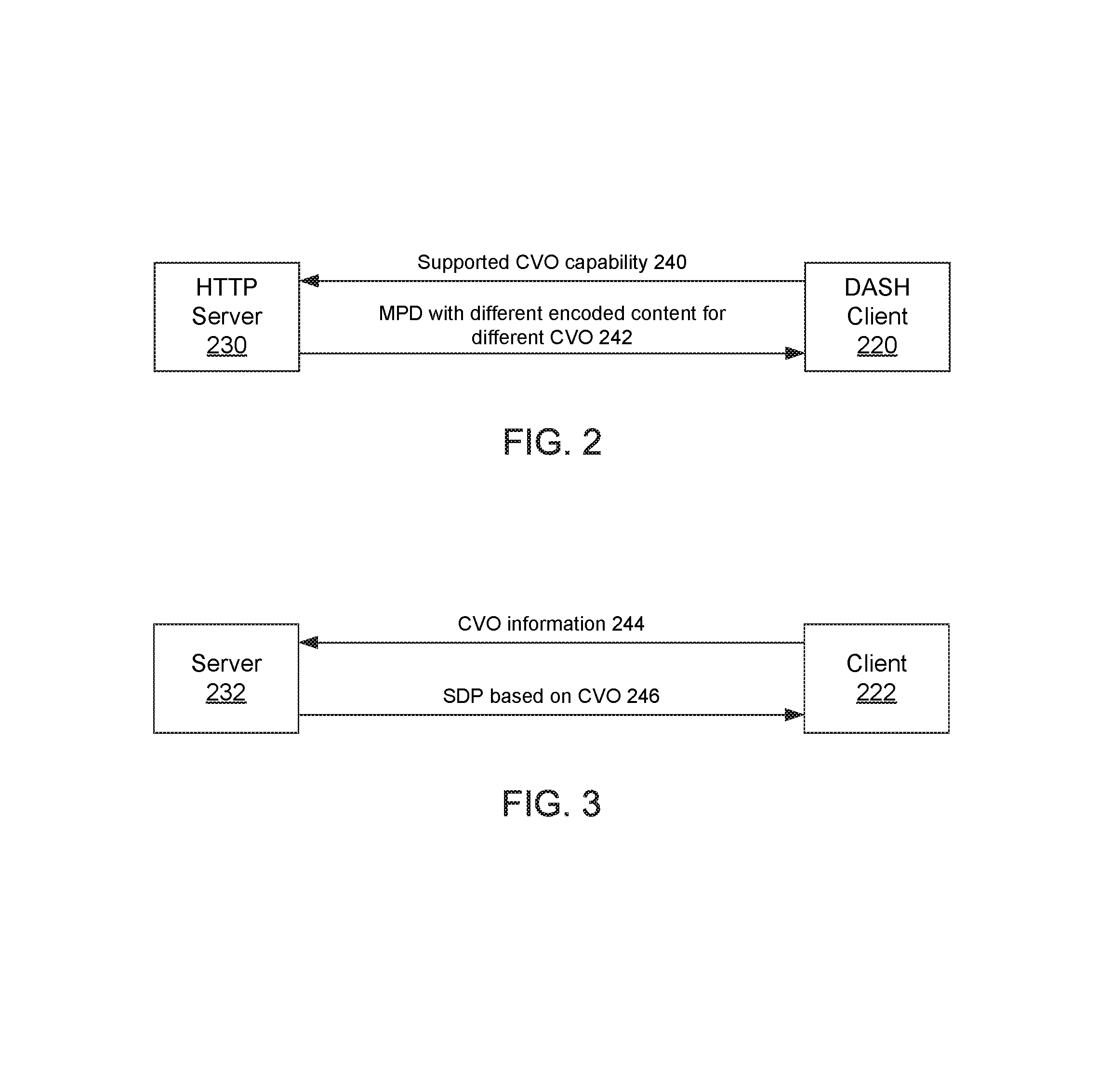 In another example, consistent with a server-client interaction as illustrated in FIG. 6, a DASH server can learn from the client (e.g., rendering client 226) that the client has the ability to process CVO information and correct for misalignment. The server can then designate in a MPD on the presence of CVO information in the DASH representations (i.e., if the DASH segments are stored content, the DASH server may have to detect the presence of CVO information before the DASH server can determine, by parsing, the 3GP files corresponding to the DASH segments and can check if video orientation information is indicated in the metadata track). The DASH client upon reception of the MPD can then activate a video-orientation engine to process the signaled CVO information (i.e., parsing of the 3GP files corresponding to DASH representations) in the DASH segments and correct any misalignments and cand render/display video with correct alignment.