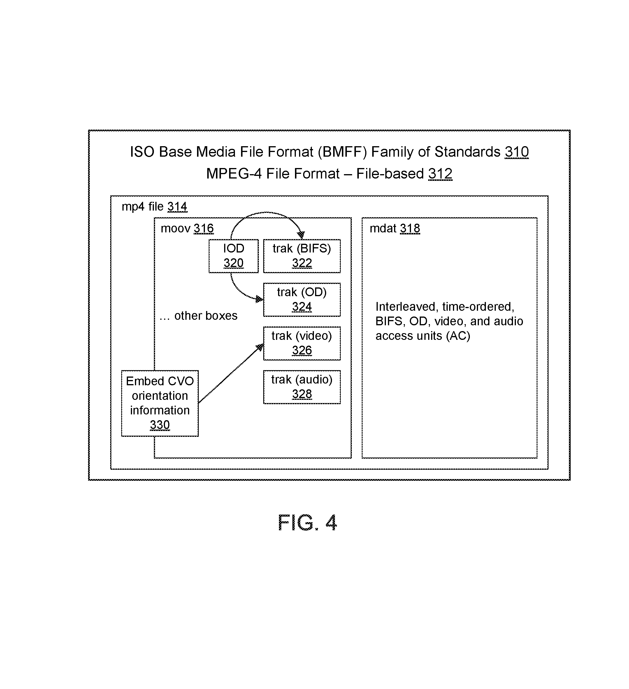 FIG. 4 illustrates an example of embedding coordination of video orientation (CVO) information in a third generation partnership project (3GPP) file format (3GP) file using an instantiation of the International Organization for Standardization-base (ISO-base) media file format (ISO-BMFF) in accordance with an example;