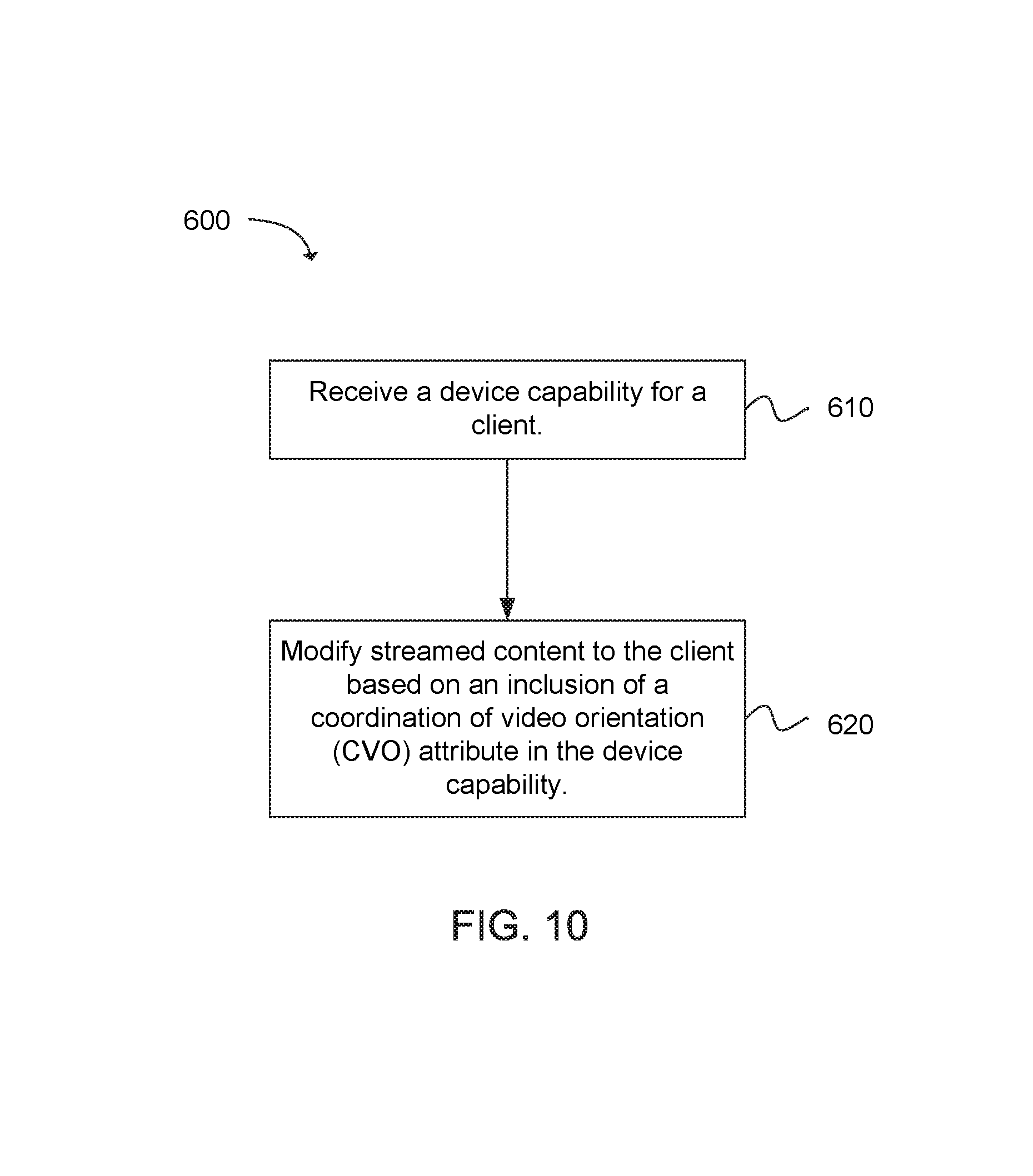 Another example provides functionality 600 of computer circuitry of a server operable to provide streaming with coordination of video orientation (CVO), as shown in the flow chart in FIG. 10. The functionality may be implemented as a method or the functionality may be executed as instructions on a machine, where the instructions are included on at least one computer readable medium or one non-transitory machine readable storage medium. The computer circuitry can be configured to receive a device capability for a client, as in block 610. The computer circuitry can be further configured to modify streamed content to the client based on an inclusion of a CVO attribute in the device capability, as in block 620.