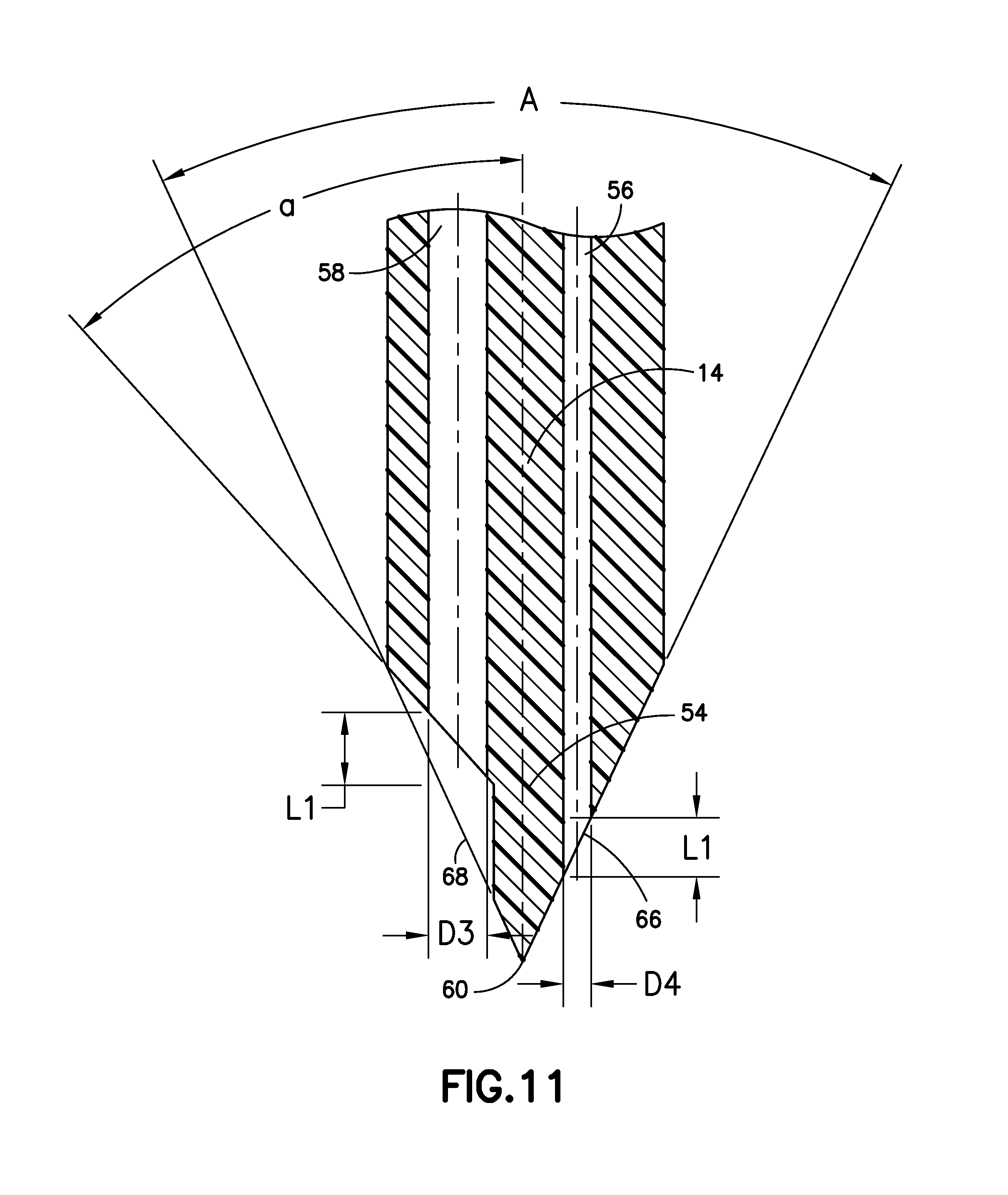 Referring to FIG. 11, the relationship between an angle A of the distal end 54 of the spike member 14 and the length L1 of the distal openings 66, 68 of the vent lumen 56 and the fluid lumen 58 along the longitudinal axis can be defined by: L1=D6/tan(A/2)=D5/tan(a/2), where D6 is the diameter of the vent lumen 56, D5 is the diameter of the fluid lumen 58, and angle a is a cut-out angle of the fluid lumen 58. In one embodiment, the angle A and cut-out angle are smaller sized or optimized for easier penetration of the stopper 84 of the second container 26. In one embodiment, the length L1 of the distal openings 66, 68 of the spike member 14 are shorter in the longitudinal direction of the spike member 14 than the thickness of the thinnest stopper according to ISO 8362-2:2008 in order to prevent leakage during penetration of the stopper 84. If the distal openings 66, 68 are longer than the thickness of the stopper 84, there will be an open channel for a short time during penetration and leakage may occur through the open channel due to the pressurized contents of the second container 26.
