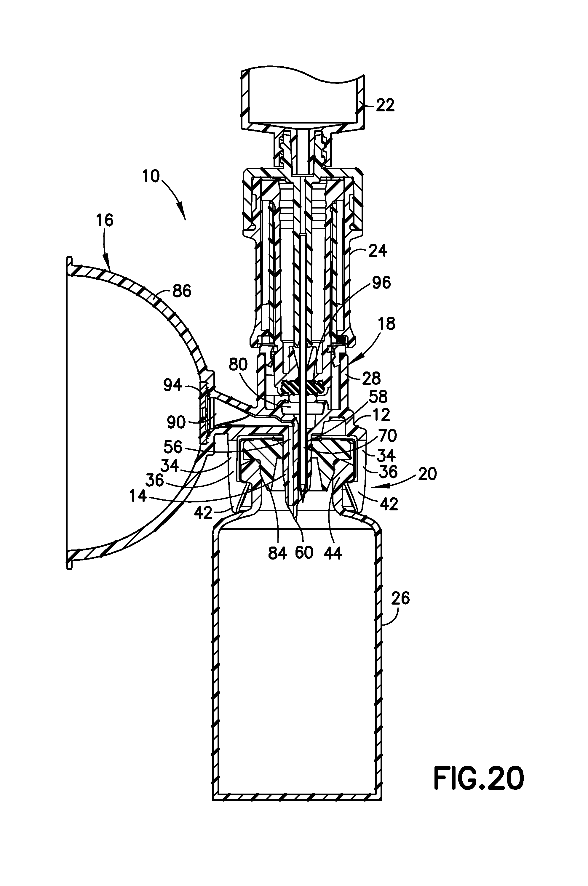 FIG. 19 is a right cross-sectional view of the vial access device shown in FIG. 1 according to one embodiment of the present invention, showing the vial access device secured to a container.