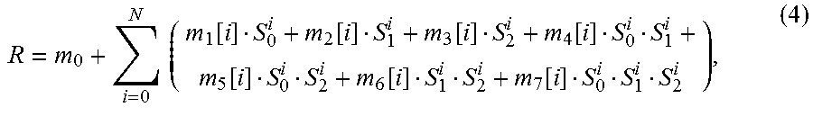 where the coefficients m are transmitted in the Dolby Vision metadata and depend on the current segment and color channel. The order N is specified in the Dolby Vision metadata as well. The calculation can be carried out in fixed point or 32 bit floating point.