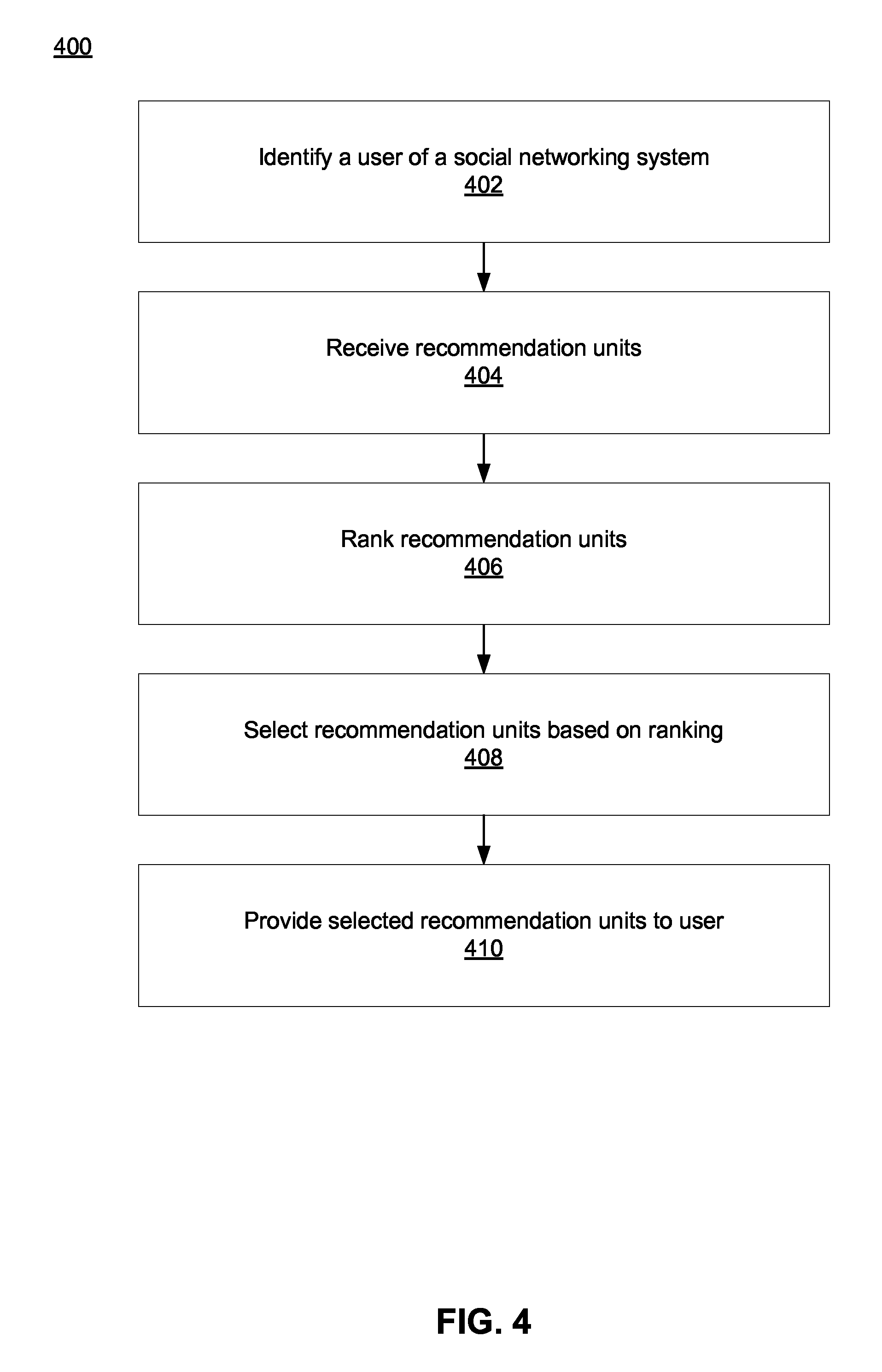 identifying a user of a social networking system; maintaining, at the social networking system, a plurality of data stores including a content data store comprising a plurality of objects and an edge data store comprising plurality of connections therebetween; receiving, at the social networking system, a plurality of recommendation units for the user, each recommendation unit including a link to a recommendation that suggests the user perform an action in the social networking system on an object in the content data store identified by the recommendation unit, the action performed by the user, responsive to the user accessing the link, being stored in the edge data store by the social networking system; retrieving, from the edge data store, information describing one or more connections in the edge data store between the user and the object identified by each of the recommendation units; determining, for an additional user of the social networking system, the additional user's prior interactions with the object identified by each recommendation unit based on the retrieved information describing one or more connections in the edge data store between the user and the object identified by each recommendation unit; computing a score in a first dimension for each of the plurality of recommendation units based at least in part on the determined prior interactions of the additional users of the social networking system with the object identified by each recommendation unit; receiving a score in a second dimension from a content provider associated with one or more sponsored recommendation units of the plurality of recommendation units; converting at least the score in the first dimension or the score in the second dimension into scores in a common dimension; increasing a score in the common dimension for each sponsored recommendation unit based on the received score from the content provider associated with the sponsored recommendation unit; ranking the plurality of recommendation units based on the scores in the common dimension; selecting one or more recommendation units based at least in part on the ranking; organizing a user interface to include the selected one or more recommendation units, wherein the selected one or more recommendation units are ordered within a limited display space in the user interface according to the ranking; and sending the organized user interface for display in a computing device of the user. 7. The method of 8. The method of determining, in association with a sponsored recommendation unit, an expected-value score in the second dimension, wherein the expected-value score is based at least in part on the received score in the second dimension from the content provider; converting the expected-value score into the common dimension; modifying a score in the common dimension associated with each sponsored recommendation unit based on the expected-value score in the common dimension; and ranking the recommendation units based at least in part on the scores. 9. The method of 10. The method of increasing the score in the common dimension associated with a sponsored recommendation unit by an amount determined in part by the expected-value score.