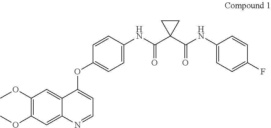 Commonly assigned PCT Patent Publication No. WO 2005/030140, incorporated by reference herein in its entirety, discloses novel inhibitors of multiple receptor tyrosine kinases (RTKs) implicated in tumor growth and angiogenesis, pathologic bone remodeling, and metastatic progression of cancer. In particular, the compound N-{4-[(6,7-dimethoxyquinolin-4-yl)oxy]phenyl}-N′-(4-fluorophenyl) cyclopropane-1,1-dicarboxamide is specifically described in WO 2005/030140 as an RTK inhibitor. The chemical structure of N-{4-[(6,7-dimethoxyquinolin-4-yl)oxy]phenyl}-N′-(4-fluorophenyl) cyclopropane-1,1-dicarboxamide is represented by Compound 1.