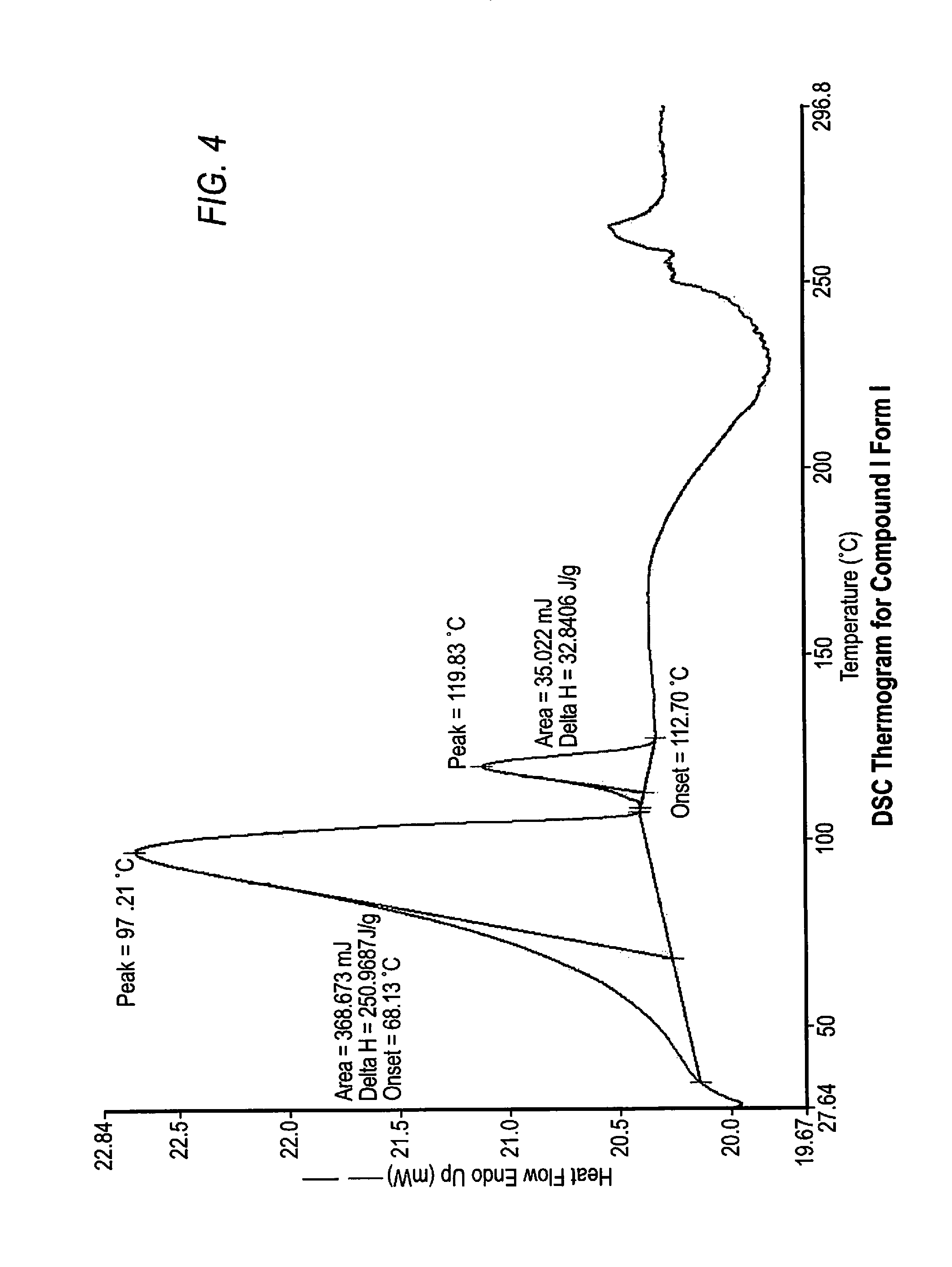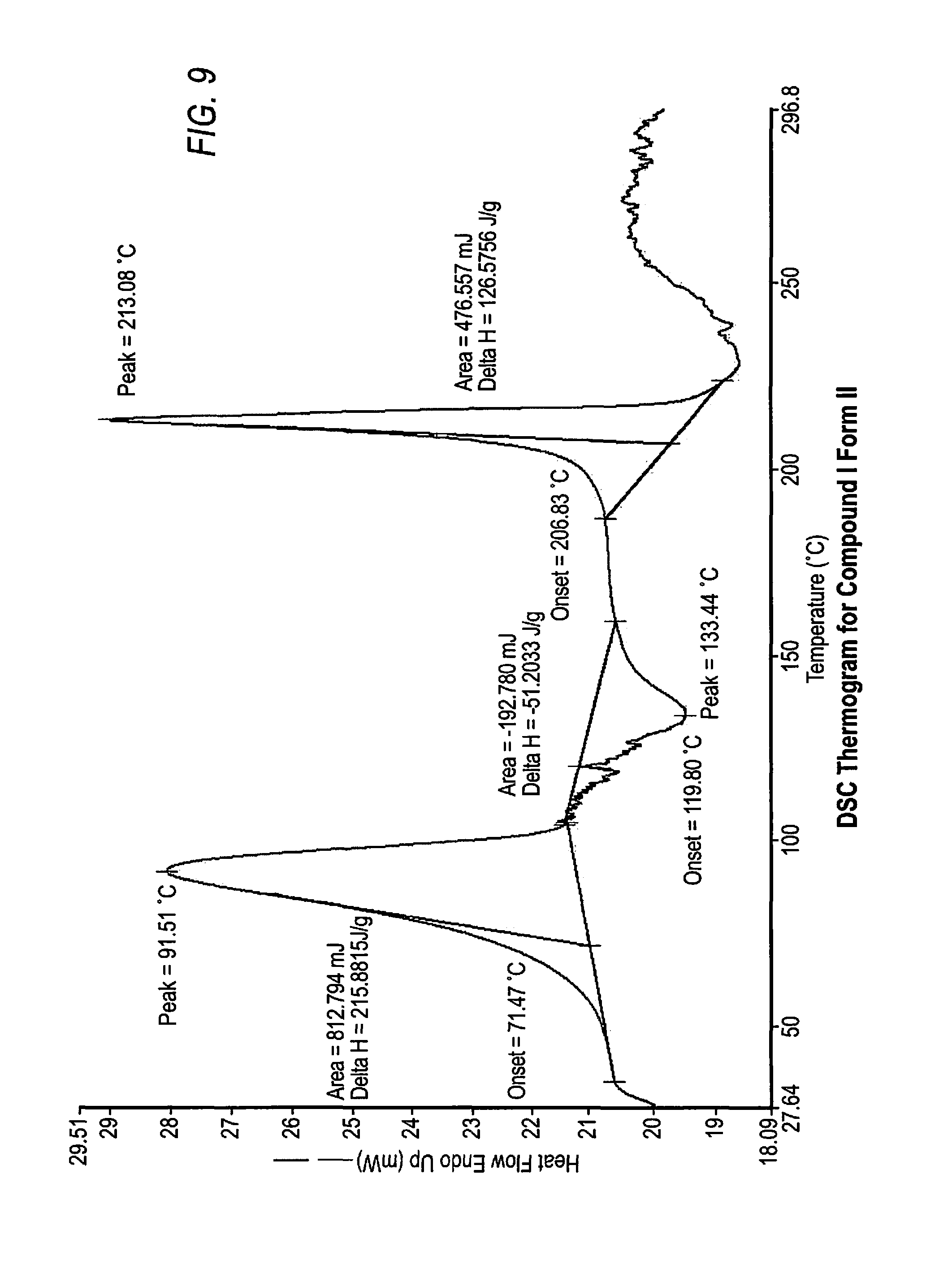 The DSC thermogram (FIG. 9) showed two endotherms, the first at onset 71.47° C. was a broad peak corresponding to loss of solvent/water. An exotherm was observed at onset approximately 119.8° C., which suggests recrystallization to another form. A second endotherm was noted at onset 206.83° C., which corresponds to the melting point of Compound 1 Form III.