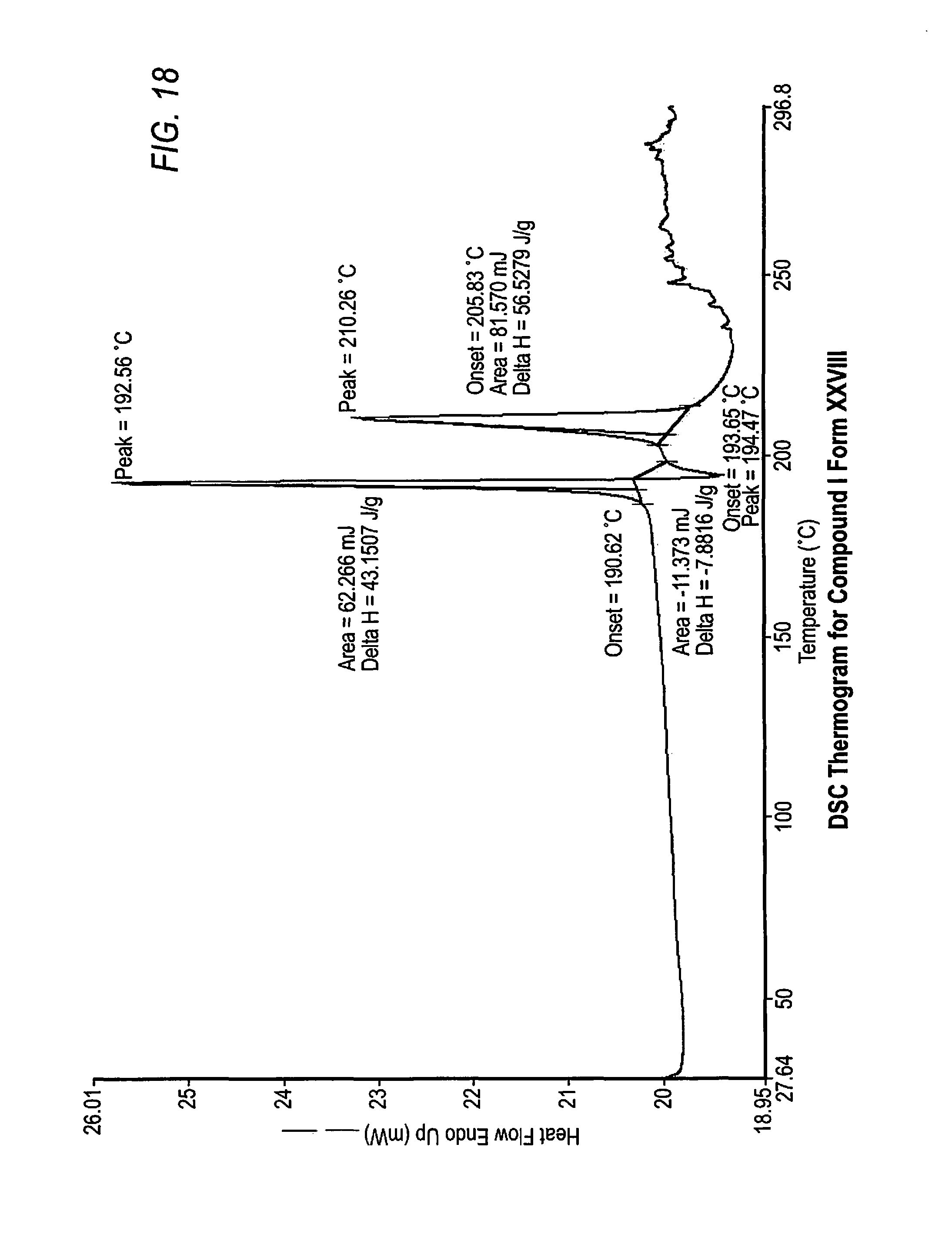 TG/DTA (FIG. 17) showed no weight loss from 25° C. to 180° C., confirming that the material was an anhydrous form. DSC (FIG. 18) showed an initial endothermic event at onset 190.62° C., a recrystallization exotherm at onset 193.65° C. and another endotherm at onset 205.83° C. These results indicate that Compound 1 Form XXVIII melts and recrystallizes to Compound 1 Form III which subsequently melts. The melting onset is lower than that observed for pure Compound 1 Form III (onset 220.59° C.), most likely due to lower crystallinity.