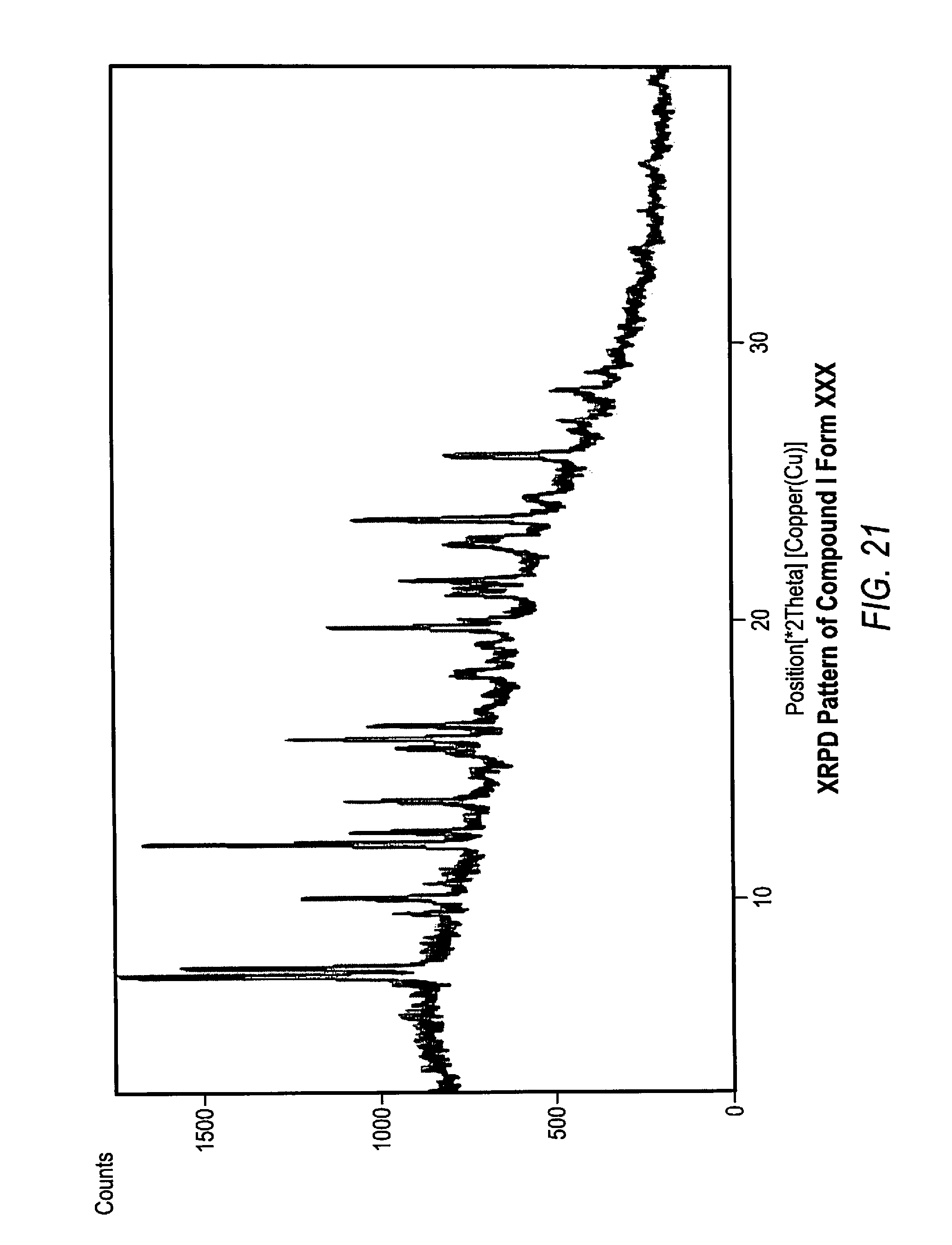 The XRPD pattern for Compound 1 Form XXX, shown in FIG. 21, is indicative of a crystalline material. Polarized light microscopy confirms that the material is crystalline with some aggregation or agglomeration present.