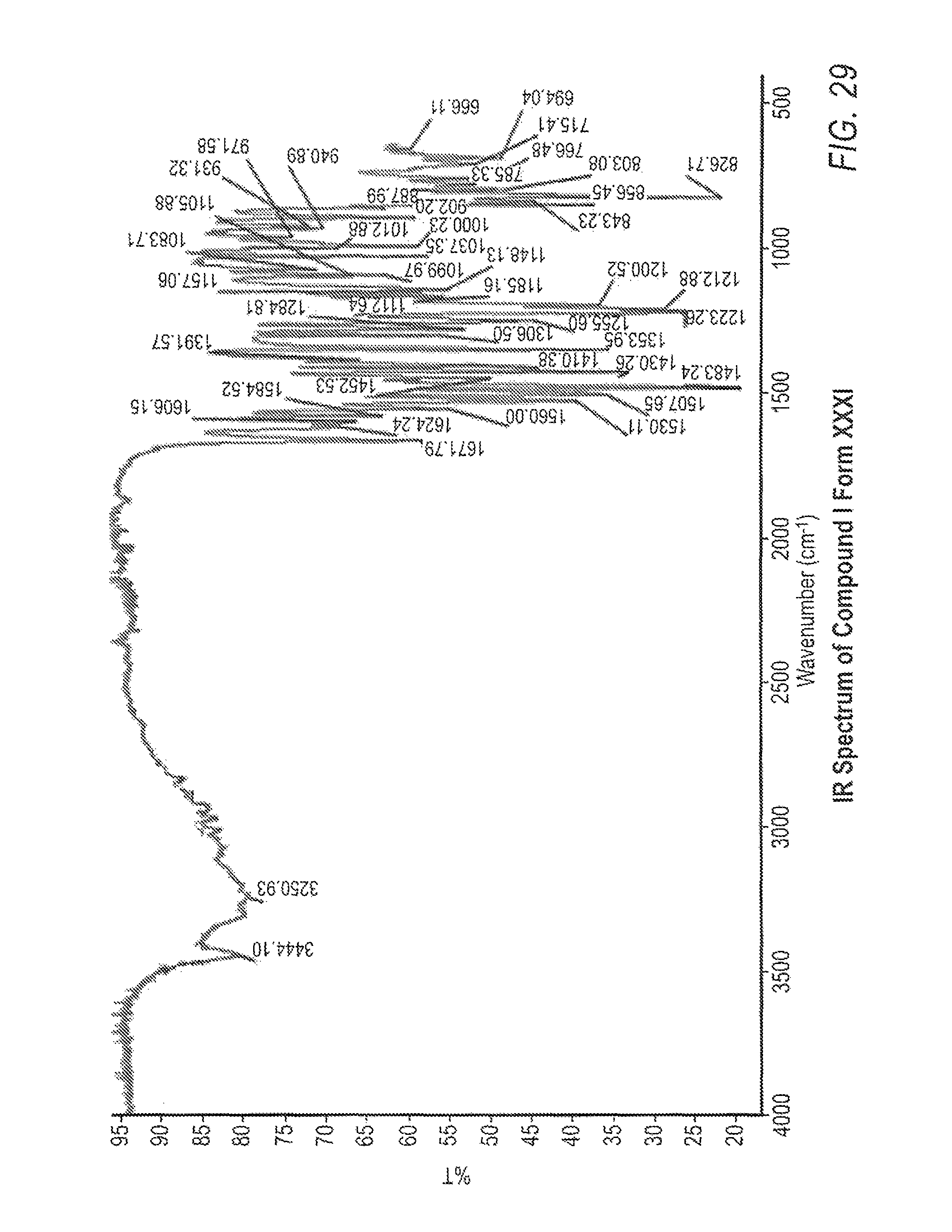 1H NMR (FIG. 30) of Compound 1 Form Compound 1 XXXI showed the material to conform to structure. Infra-red spectroscopy (FIG. 29) conformed to the spectrum of Compound 1 Form I (FIG. 5) within experimental error. FTIR (cm−1): 3444, 3251, 1672, 1530, 1507, 1483, 1430, 1354, 1256, 1223, 1148, 1000, 856, 843, 826.