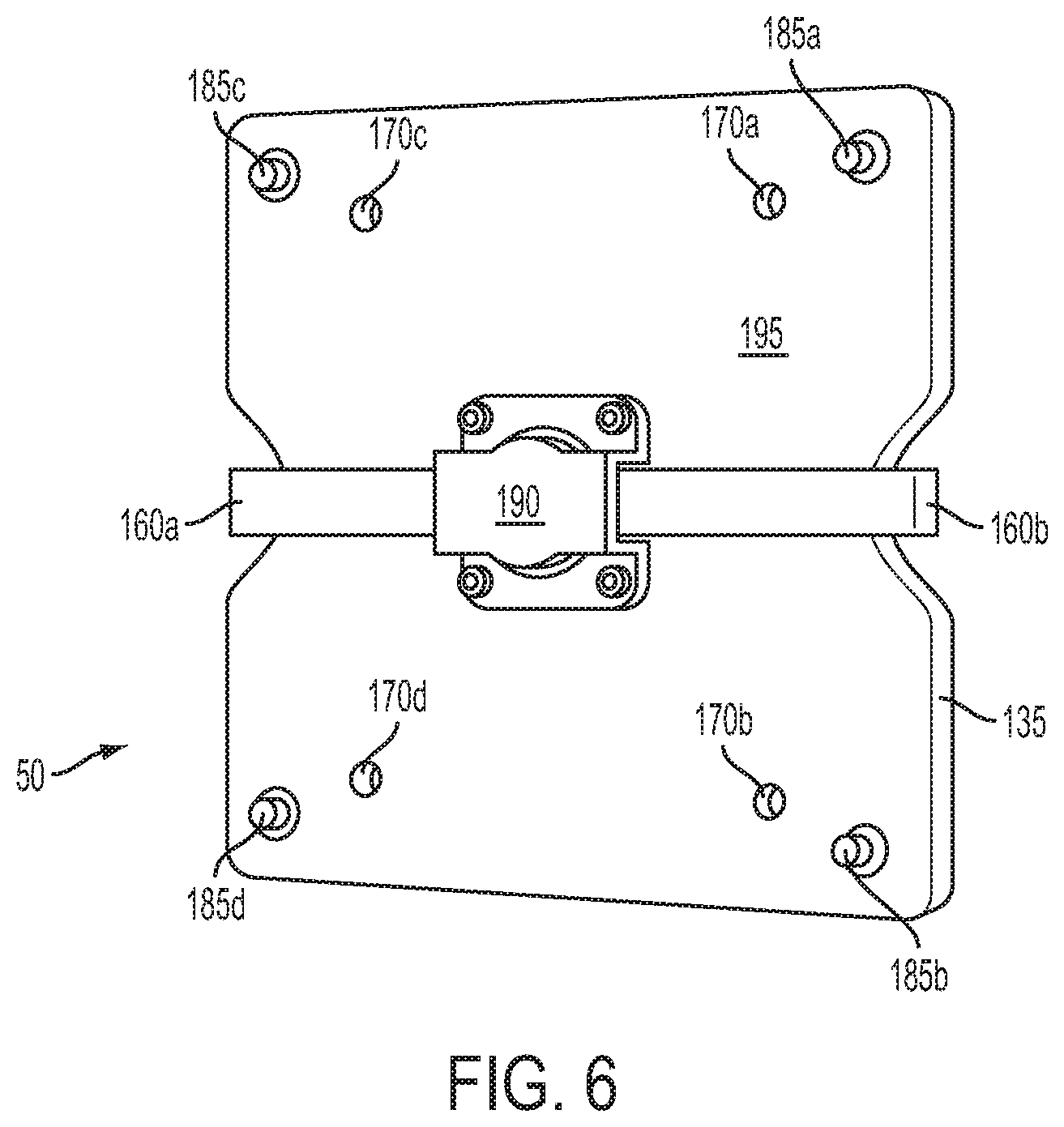 [0066]FIG. 6 is a perspective front view showing the front surface 195 of another embodiment of the mount 50. The mounting plate 135 has equipment mounting holes 170a, 170b, 170c, and 170d used to attach the mounting plate 135 to a piece of equipment (not shown) by any of the fastening devices listed above. Although FIG. 6 only depicts four equipment mounting holes 170a, 170b, 170c, and 170d, any amount of equipment mounting holes 170, in any configuration, may be used to accommodate the equipment or device to be mounted. The stud nuts 185a, 185b, 185c, and 185d are used to secure the mounting studs 140a, 140b, 140c, and 140d to the mounting plate 135. The stud nuts 185a, 185b, 185c, and 185d may be any securing device and are not limited to a nut. The release mechanism 190 is secured to the mounting plate 135 and has gearing inside to pull in or push out the locking pin (e.g., locking pin 155 shown in FIG. 7) when one or both of the locking pin releases 160a and/or 160b are actuated. In another embodiment, the release mechanism 190 may include gearing to actuate the locking pin 155 against the bias of a spring. One example of how the release mechanism 190 works may be found in FIG. 7. The piece of equipment is secured to the front surface 195 of the mounting plate 135.