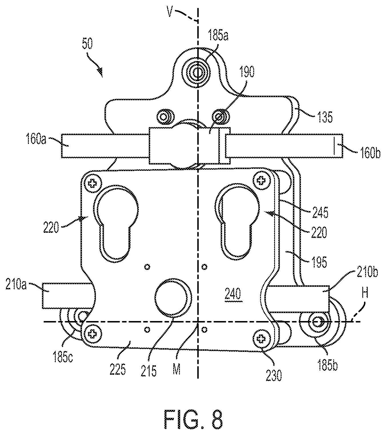 [0071]FIG. 8 depicts another embodiment of the mount 50. In this illustrative embodiment, the adaptor is a second mounting plate 225 attached to the mounting plate 135. This embodiment allows adaptors (described below), or other equipment, to be mounted to the track 10. The mounting plate 135 may have any number of mounting studs 140 required to secure the mount 50 to the track 10. If the mount 50 is required to secure a heavy load, additional mounting studs 140 may be added to increase the load capacity of the mount 50. In this embodiment, the mounting plate 135 has three stud nuts 185a, 185b, and 185c used to secure three mounting studs 140a, 140b, and 140c to the mounting plate 135. The three mounting studs 140a, 140b, and 140c may be in a triangle configuration as shown in FIG. 8. Mounting studs 185b and 185c lie along a horizontal axis H and mounting stud 185a lies along a vertical axis V. A midpoint M is the point along the horizontal axis H and is equidistant between mounting studs 185b and 185c. The vertical axis passes through the midpoint M. Mounting stud 185a is positioned to engage the open area 35 of the center slot 25 when mounting studs 185b and 185c engage an open area 35 of the second outer slot 30 and the first outer slot 20 respectively of the track 10. The locking pin associated with the locking pin release 190 may also engage the open areas 25 of the center slot 25. The stud nuts 185a, 185b and 185c may be any securing device and are not limited to a nut. The release mechanism 190 is secured to the mounting plate 135 and has gearing inside to pull in or push out the locking pin (e.g., locking pin 155 shown in FIG. 7) when one or both of the locking pin releases 160a or 160b are actuated. The second mounting plate 225 is secured to the front surface 195 of the mounting plate 135 using a fastener 230 threaded into the equipment mounting holes 170 (not shown). It should be understood that the use of the fastener 230 is a non-limiting example of a type of hardware that can be used to attach the second mounting plate 225 to the mounting plate 135, in this case a screw. Other illustrative examples of fasteners include, but are not limited to bolt/nut combinations, cotter pins, rivets, and any other fastening mechanisms. The second mounting plate 225 may include two keyholes 220 disposed therethrough for mounting equipment, devices, adaptors, and/or other items.