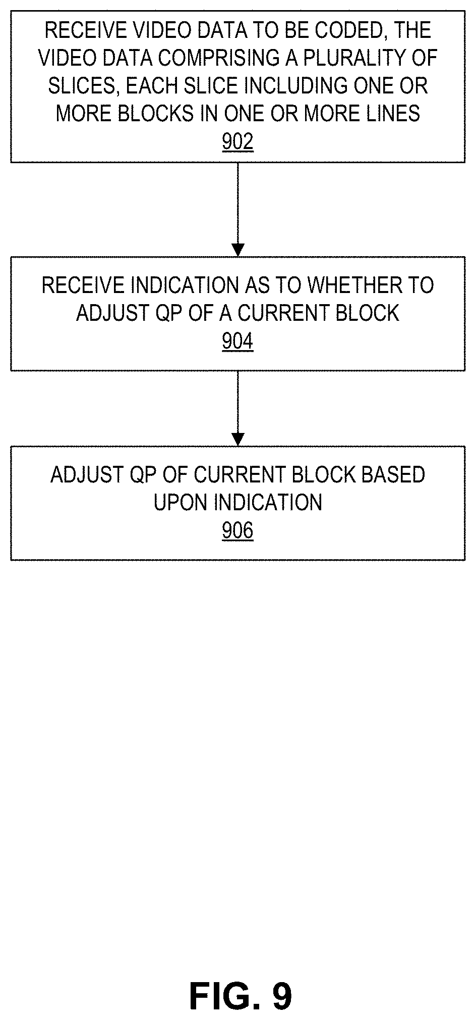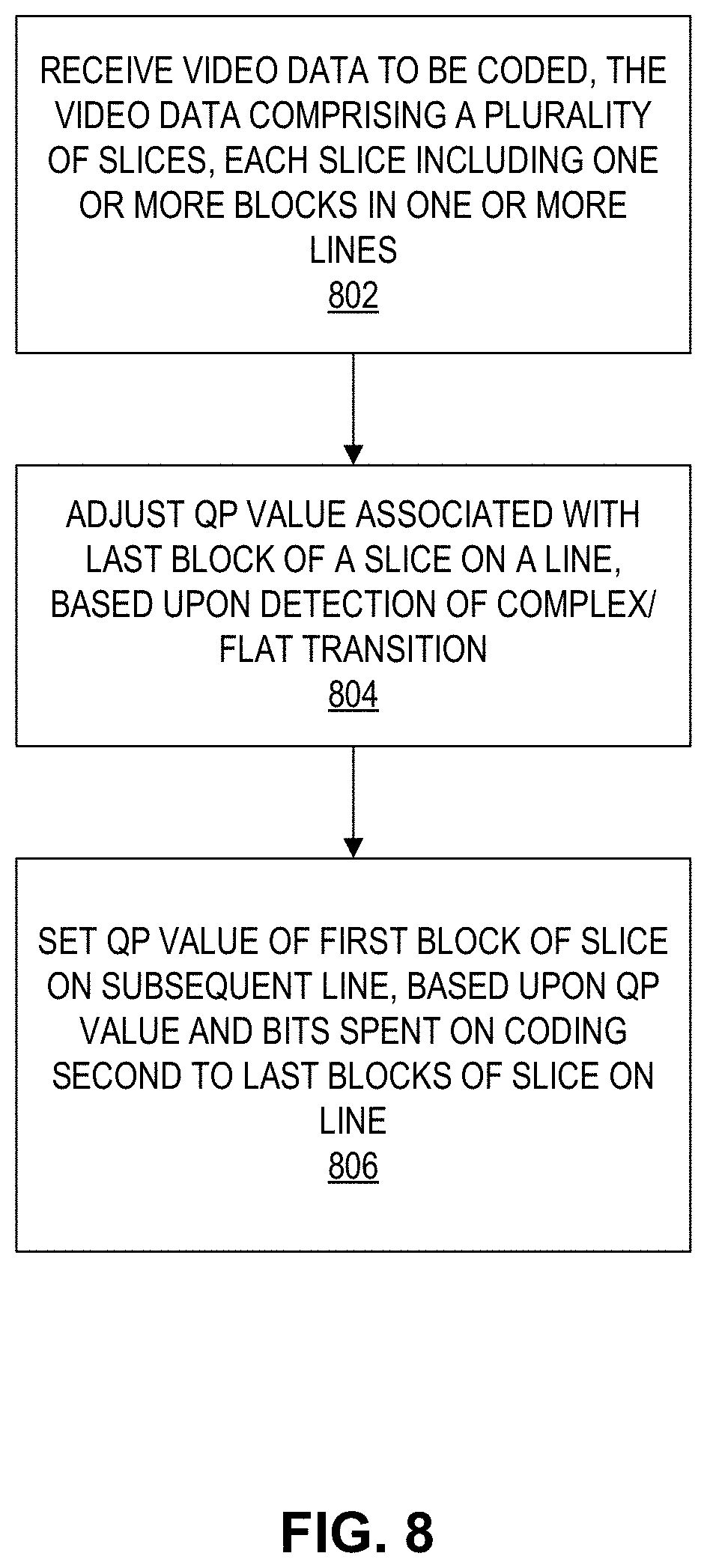 This application claims the benefit of U.S. Provisional Application No. 62/257,561, filed Nov. 19, 2015, which is hereby incorporated by reference under 37 CFR 1.57. This disclosure relates to the field of video coding and compression, and particularly to video compression for transmission over display links, such as display stream compression (DSC). Digital video capabilities can be incorporated into a wide range of displays, including digital televisions, personal digital assistants (PDAs), laptop computers, desktop monitors, digital cameras, digital recording devices, digital media players, video gaming devices, video game consoles, cellular or satellite radio telephones, video teleconferencing devices, and the like. Display links are used to connect displays to appropriate source devices. The bandwidth requirements of display links are proportional to the resolution of the displays, and thus, high-resolution displays require large bandwidth display links. Some display links do not have the bandwidth to support high resolution displays. Video compression can be used to reduce the bandwidth requirements such that lower bandwidth display links can be used to provide digital video to high resolution displays. Others have tried to utilize image compression on the pixel data. However, such schemes are sometimes not visually lossless or can be difficult and expensive to implement in conventional display devices. The Video Electronics Standards Association (VESA) has developed display stream compression (DSC) as a standard for display link video compression. The display link video compression technique, such as DSC, should provide, among other things, picture quality that is visually lossless (i.e., pictures having a level of quality such that users cannot tell the compression is active). The display link video compression technique should also provide a scheme that is easy and inexpensive to implement in real-time with conventional hardware. The systems, methods and devices of this disclosure each have several innovative aspects, no single one of which is solely responsible for the desirable attributes disclosed herein. In one aspect, an apparatus for encoding video data is provided. The apparatus can include a memory for storing the video data. The apparatus can also include a hardware processor operationally coupled to the memory. The processor may be configured to receive the video data to be coded using multiple slices, each slice including one or more blocks organized in one or more lines, wherein a line can include blocks for multiple slices. The process may be further configured to determine whether at least some of a current block and neighboring blocks of the current block include a transition from a complex region to a flat region. The processor may also be configured to adjust a quantization parameter (QP) for coding the current block based on the determination. In another aspect, an apparatus for decoding video data is provided. The apparatus can include a memory for storing the video data. The apparatus can also include a hardware processor operationally coupled to the memory. The processor may be configured to receive the video data to be coded, the video data including information associated with multiple slices, each slice including one or more blocks organized in one or more lines, wherein a line can include blocks for multiple slices. The processor may also be configured to receive an indicator of whether to adjust a quantization parameter (QP) for coding the current block, wherein a value of the indicator is based on a determination of whether at least some of a current block and neighboring blocks of the current block include a transition from a complex region to a flat region. The processor may be further configured to adjust the QP for coding the current block based at least in part on the value of the indicator. In another aspect, an apparatus for encoding video data is provided. The apparatus can include a memory for storing the video data. The apparatus can also include a hardware processor comprising an integrated circuit, the hardware processor being operationally coupled to the memory. The processor may be configured to receive a slice of video data to be coded corresponding to a spatially distinct region in a frame of the video data, the slice including one or more blocks organized in one or more lines, and wherein the slice can be coded independently without information from any other slices of video data. The processor may be further configured to determine a complexity value of a current block corresponding to a last block of the slice on a particular line. The processor may be further configured to determine whether the current block includes a first transition from a complex region to a flat region based at least in part upon the determined complexity value of the current block, wherein complex regions are characterized as having higher complexity in comparison to flat regions. The processor may be further configured to, in response to a determination that the current block includes the first transition, decrease a quantization parameter (QP) for coding the current block. In another aspect, a computer-implemented method for encoding video data is provided. The method comprises receiving a slice of video data to be coded corresponding to a spatially distinct region in a frame of the video data, the slice including one or more blocks organized in one or more lines, and wherein the slice can be coded independently without information from any other slices of video data. The method further comprises determining a complexity value of a current block corresponding to a last block of the slice on a particular line. The method further comprises determining whether the current block includes a first transition from a complex region to a flat region based at least in part upon the determined complexity value of the current block, wherein complex regions are character