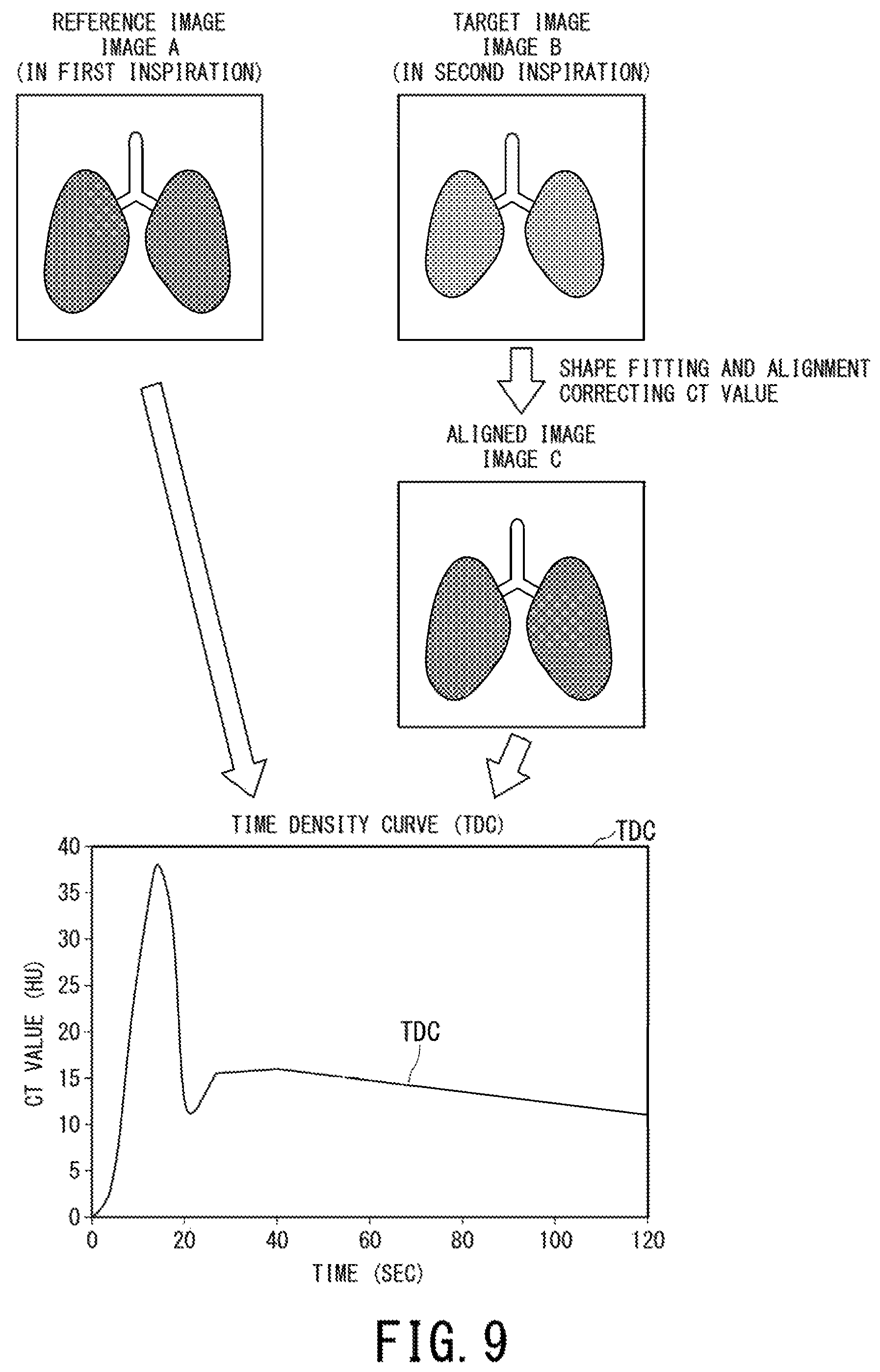 This application is based upon and claims the benefit of priority from Japanese Patent Application No. 2016-087957, filed on Apr. 26, 2016, and Japanese Patent Application No. 2017-084123, filed on Apr. 21, 2017, the entire contents of all of which are incorporated herein by reference. An embodiment of the present invention relates to a medical image processing apparatus and a medical image diagnostic apparatus. In dynamic contrast imaging, a process in which a contrast medium administered to a subject flows into an organ or tissue to be diagnosed and flows out of the organ or tissue is imaged over plural time phases. Pixel values of medical images acquired by dynamic imaging over plural time phases reflect changes in a level of the contrast medium in the blood. A time density curve (TDC), which is a graphic plot of successive changes in the pixel values, allows a level of a tissue lesion, such as a degree of malignancy to be determined. Also, by analyzing the TDC, it is possible to learn a half life of the contrast medium in the blood, a blood flow rate, and a blood volume, and thereby qualitatively and quantitatively evaluate the blood flow. In this way, various diseases are diagnosed based on results of blood flow dynamics analysis conducted using medical images obtained by dynamic imaging. With such dynamic imaging, positional displacement occurs due to breathing of the subject during the imaging, posing a problem in conducting image analysis. For example, dynamic imaging in a lung field involves holding breath a few times. The lungs are organs whose volumes change greatly with each breath. It is difficult for the subject to inflate the lungs in a same way each time imaging is performed. Because images are acquired by performing imaging by holding breath a few times, the volumes and shapes of the lungs in the acquired images may vary each time. In such a case, a conventional technique aligns plural images differing from one another in time phase and conducts blood flow dynamics analysis based on the aligned images using a time density curve. In the accompanying drawings: A medical image processing apparatus according to an embodiment will be described below with reference to the drawings. In one embodiment, a medical image processing apparatus which analyzes blood flow dynamics in a predetermined region of a subject, the blood flow dynamics being generated from medical images obtained by imaging the predetermined region in time sequence over a plurality of time phases. The medical image processing apparatus comprising: memory circuitry configured to store a program; and processing circuitry configured to correct pixel values of a second medical image according to an amount of deformation of the second medical image when the second medical image is aligned with a first medical image by executing the program read out from the memory circuitry, the first medical image and the second medical image being among the medical images in the plurality of time phases. (1) Configuration The communication control circuit 85 implements various communication protocols according to network topologies. The electronic network as referred to herein means an entire information network using telecommunications technology and includes a hospital backbone LAN, a wireless/wired LAN, the Internet, a telephone communication network, an optical fiber communication network, a cable communication network, and a satellite communication network. The medical image processing apparatus 100 acquires image data of medical images from the PACS 200 via the electronic network. Note that the PACS 200 and medical image processing apparatus 100 may be built as systems in the cloud. The processing circuitry 81 may be configured of a special-purpose hardware or be configured to implement various types of functions by software processing of its built-in processor. As an example here, a description will be given of a case where the processing circuitry 81 implements various types of functions by software processing of its processor. The above-described term “processor” means, e.g., a circuit such as a special-purpose or general-purpose CPU, a special-purpose or general-purpose graphics processing unit (GPU), an application specific integrated circuit (ASIC), a programmable logic device, and a field programmable gate array (FPGA). The above-described programmable logic device includes, e.g., a simple programmable logic device (SPLD) and a complex programmable logic device (CPLD). The processing circuitry 81 implements various types of functions by reading out programs stored in the memory circuit 82 and executing the programs. Additionally or alternatively, the processing circuitry 81 implements various types of functions by reading out programs stored in its own processer and executing the programs. Further, the processing circuitry 81 may be configured of a single processor or may be configured of a combination of plural processors which are independent of each other. In the latter case, plural memory circuits 82 may be provided for the respective processors so that programs executed by each processor are stored in the memory circuit 82 corresponding to this processor. As a further modification, one memory circuit 82 may collectively store all the programs corresponding to the respective functions of the plural processors. The memory circuit 82 is configured of, e.g. a hard disc, an optical disc, and a semiconductor memory element such as a RAM (Random Access Memory) and a flash memory. The memory circuit 82 may be configured as a circuit to which a portable medium such as a USB (Universal Serial Bus) memory and a DVD (Digital Video Disk) is detachably connected. The memory circuit 82 stores image data and data necessary for executing programs in addition to various types of programs executed by the processing circuitry 81 (including an application program and an operating system). Additionally, the memory circuit 82 may st
